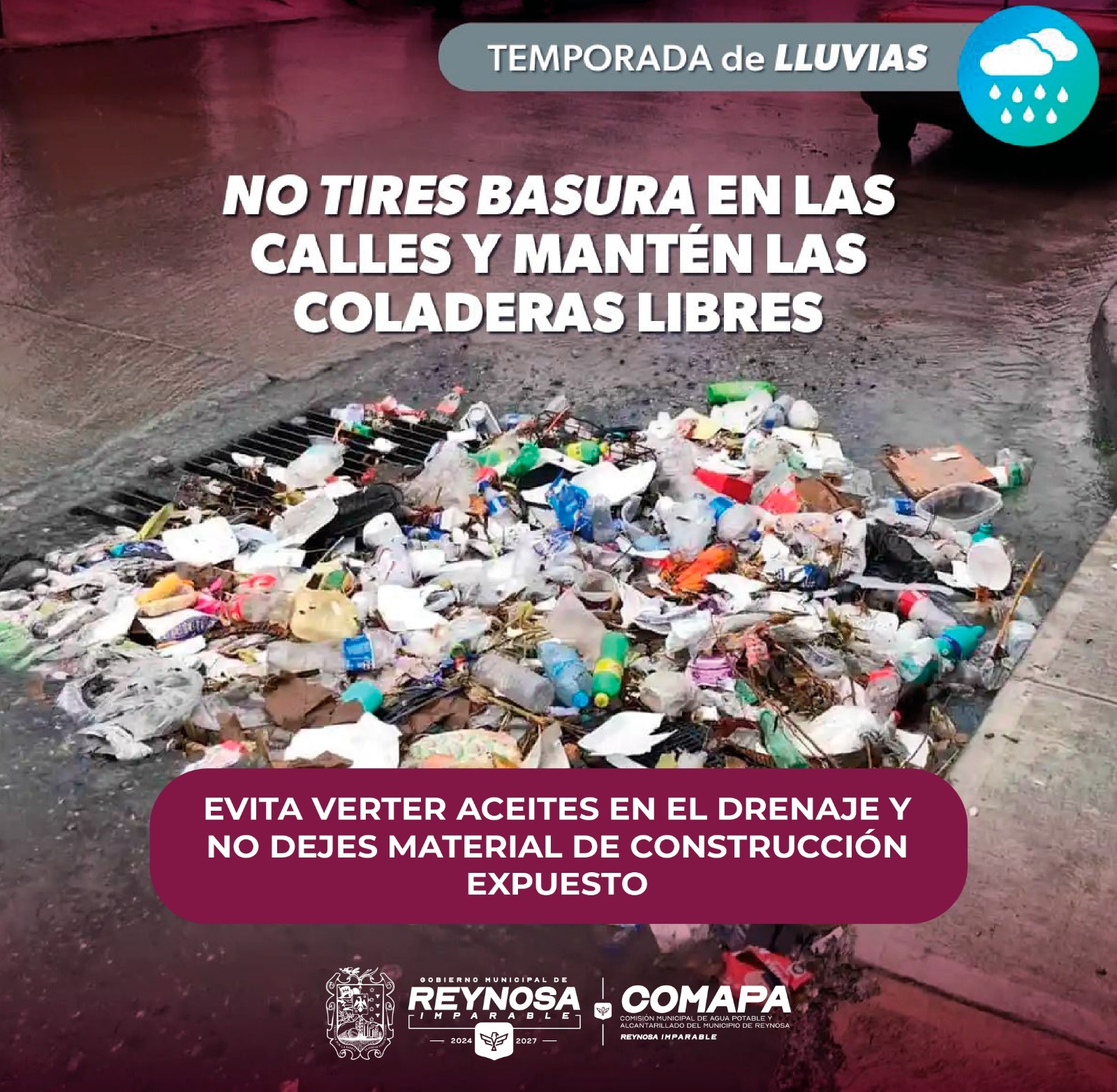 La Comisión Municipal de Agua Potable y Alcantarillado de Reynosa invita a la ciudadanía a reforzar las acciones de cuidado y limpieza, evitando tirar basura en la vía pública para mantener el correcto funcionamiento de la red de drenaje sanitario y pluvial.