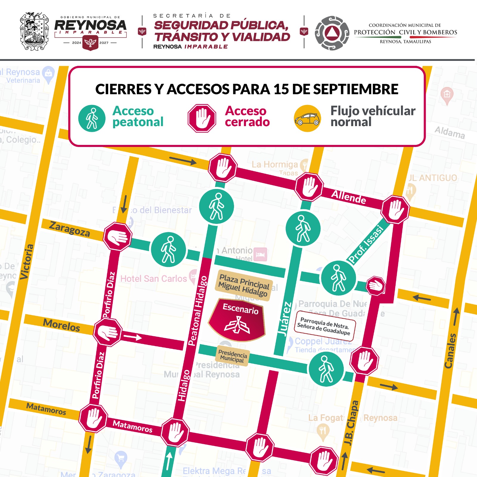 El Gobierno de Reynosa te invita a conocer las delimitaciones de vialidad, que hoy lunes 15 de septiembre realizará en la Zona Centro, para resguardar a los asistentes a la ceremonia del 215 Aniversario del Inicio de la Lucha por la Independencia de México. Prepárate a utilizar vías alternas si vas a circular por el área.