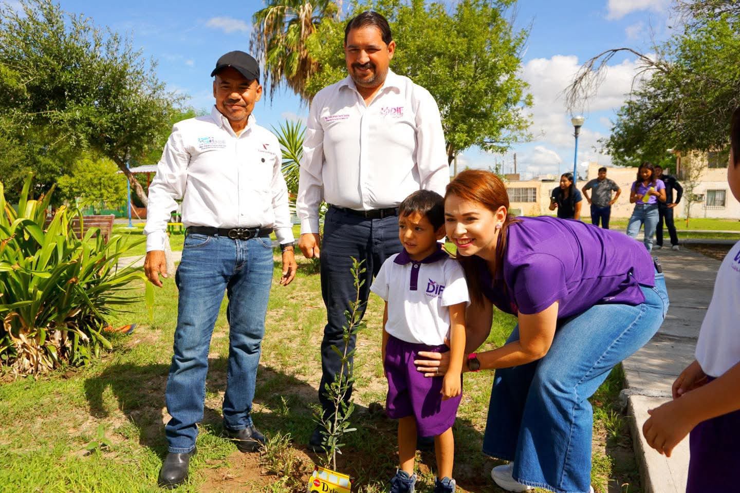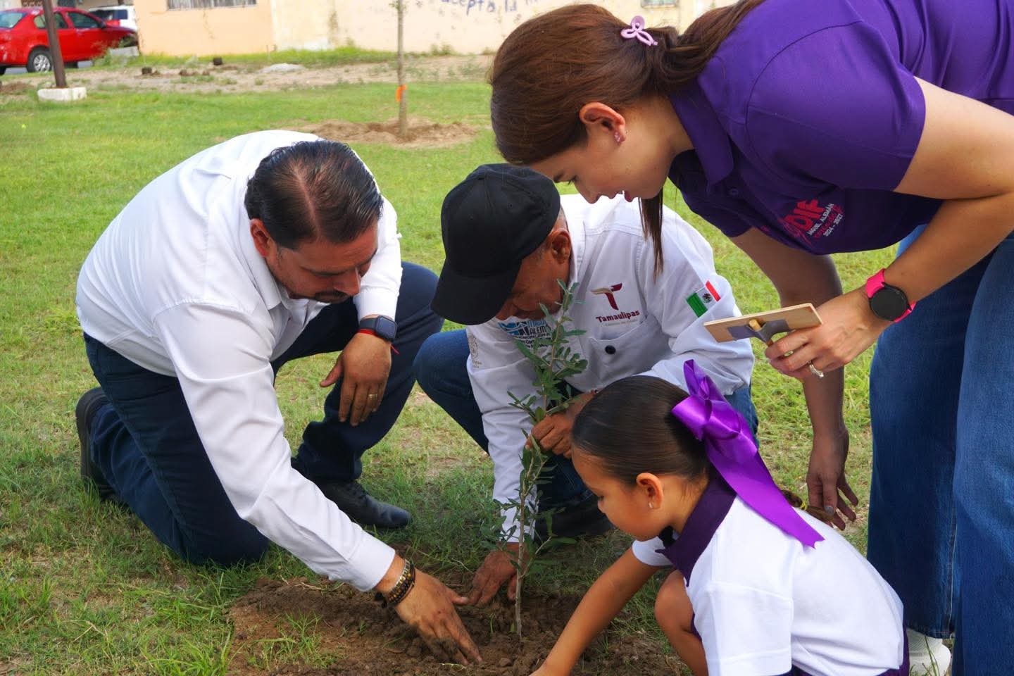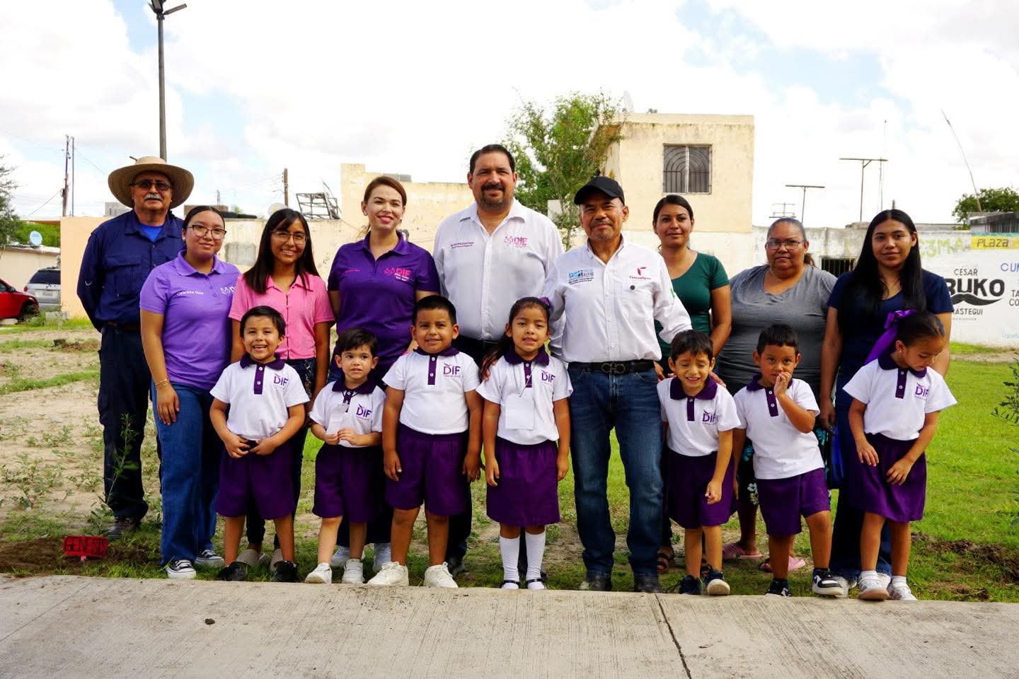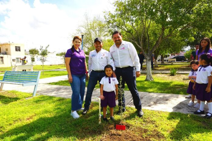 MIGUEL ALEMÁN, TAM. – Impulsando en las nuevas generaciones la cultura del cuidado del medio ambiente a través de la Campaña Permanente de Reforestación, el Alcalde Biol. Ramiro Cortez Barrera sembró más árboles en la plaza de la colonia Infonavit Industrial, acompañando a los niños del Centro de Atención Infantil Comunitario (CAIC) del poblado Los Guerra.