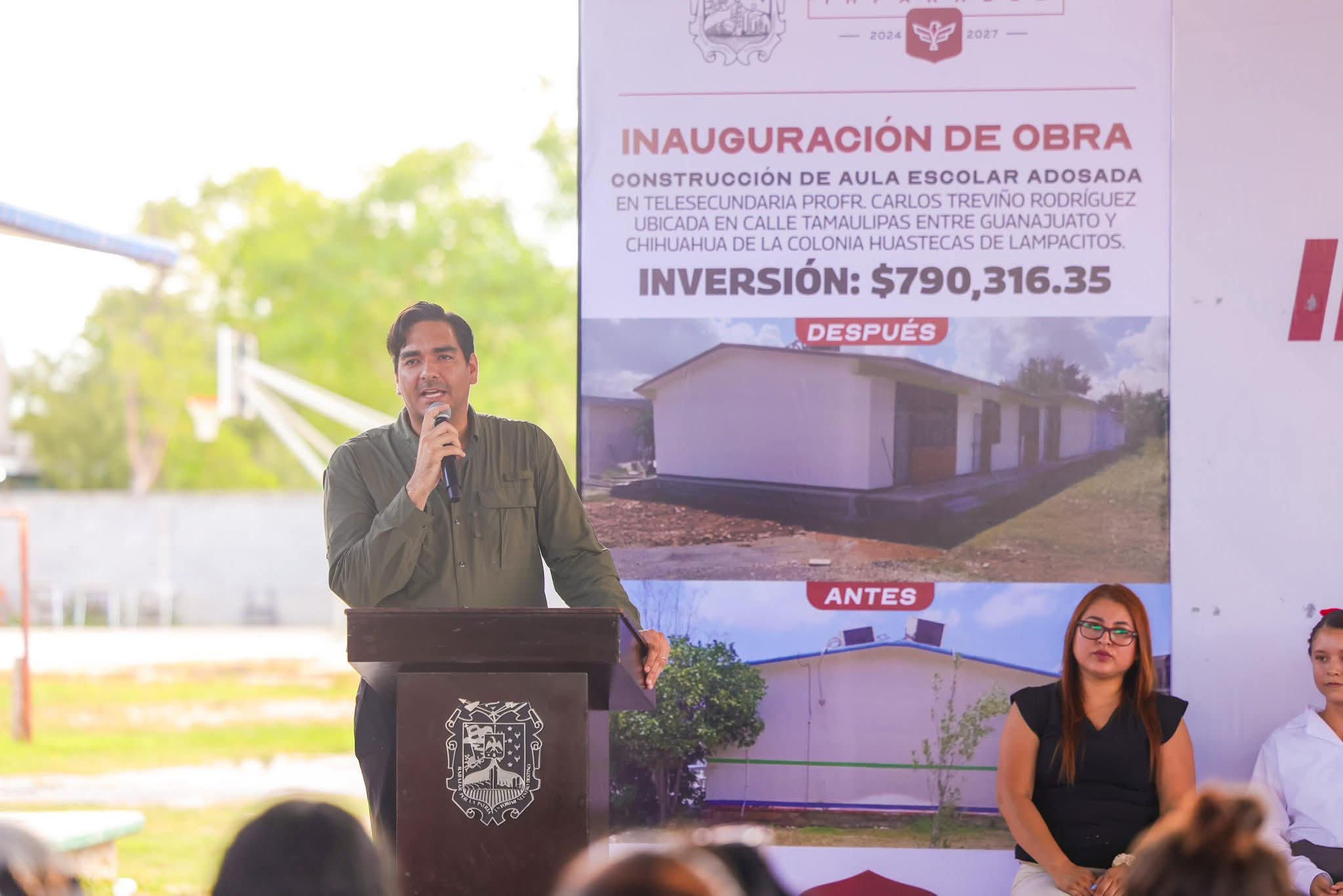 El Presidente Municipal Carlos Peña Ortiz en compañía de los estudiantes que forjan el futuro de Reynosa y del país, desde la Escuela Telesecundaria Profesor Carlos Treviño Rodríguez, de la colonia Lampacitos, inauguró el Aula Escolar Adosada que beneficiará a la presente y futuras generaciones.