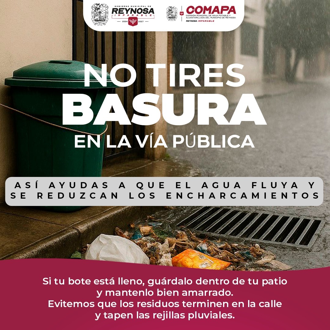 La Comisión Municipal de Agua Potable y Alcantarillado de Reynosa hace un llamado a la ciudadanía a evitar arrojar basura en calles y banquetas, con el objetivo de permitir que el agua fluya correctamente por las rejillas pluviales y así reducir los encharcamientos e inundaciones en la ciudad en esta temporada de lluvias.