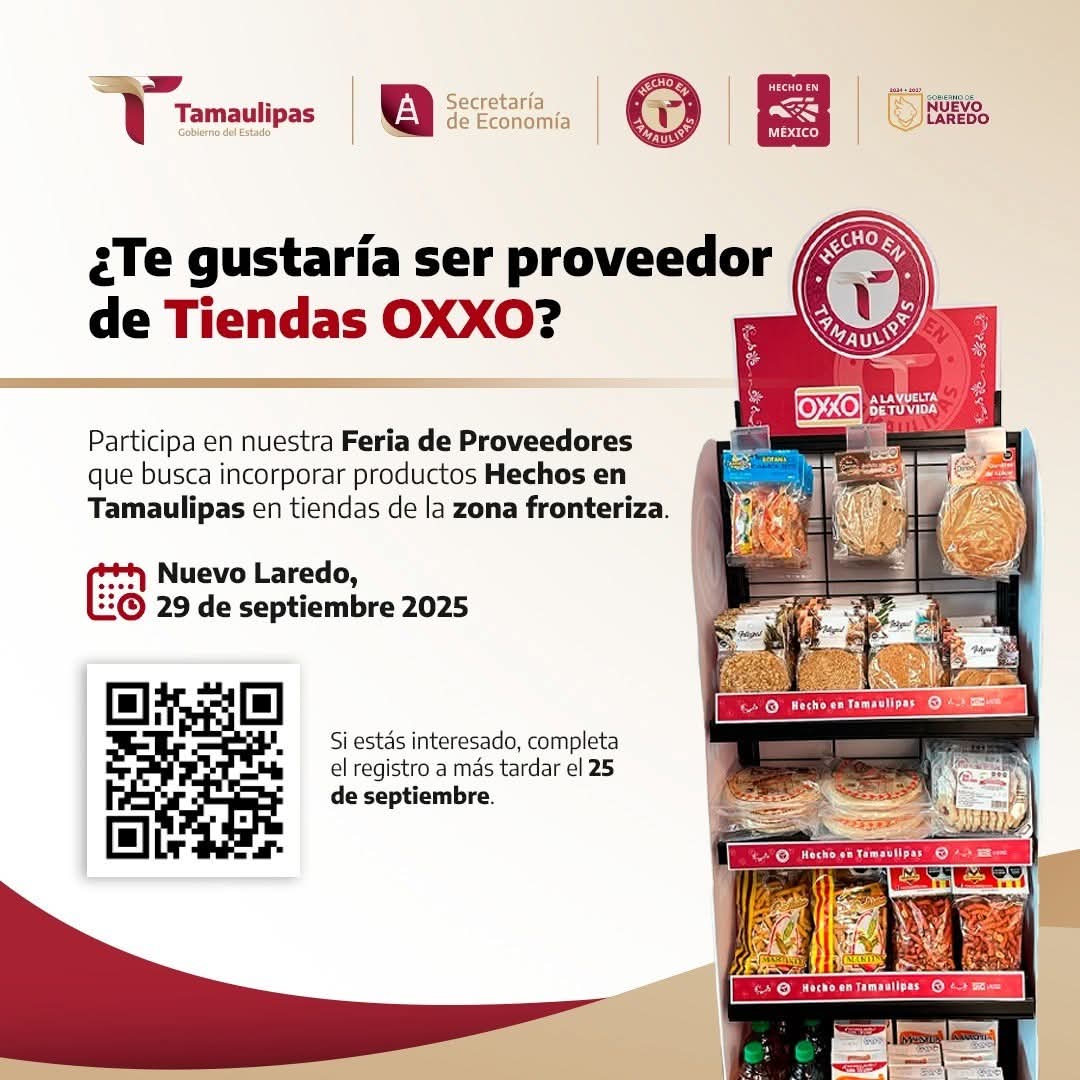 MIGUEL ALEMÁN, TAM. – El Gobierno del Biol. Ramiro Cortez Barrera invita a los emprendedores y comerciantes a participar en la Feria de Proveedores de Tiendas OXXO, con la que el Gobierno del Estado busca incorporar productos Hechos en Tamaulipas en las tiendas de la zona fronteriza.