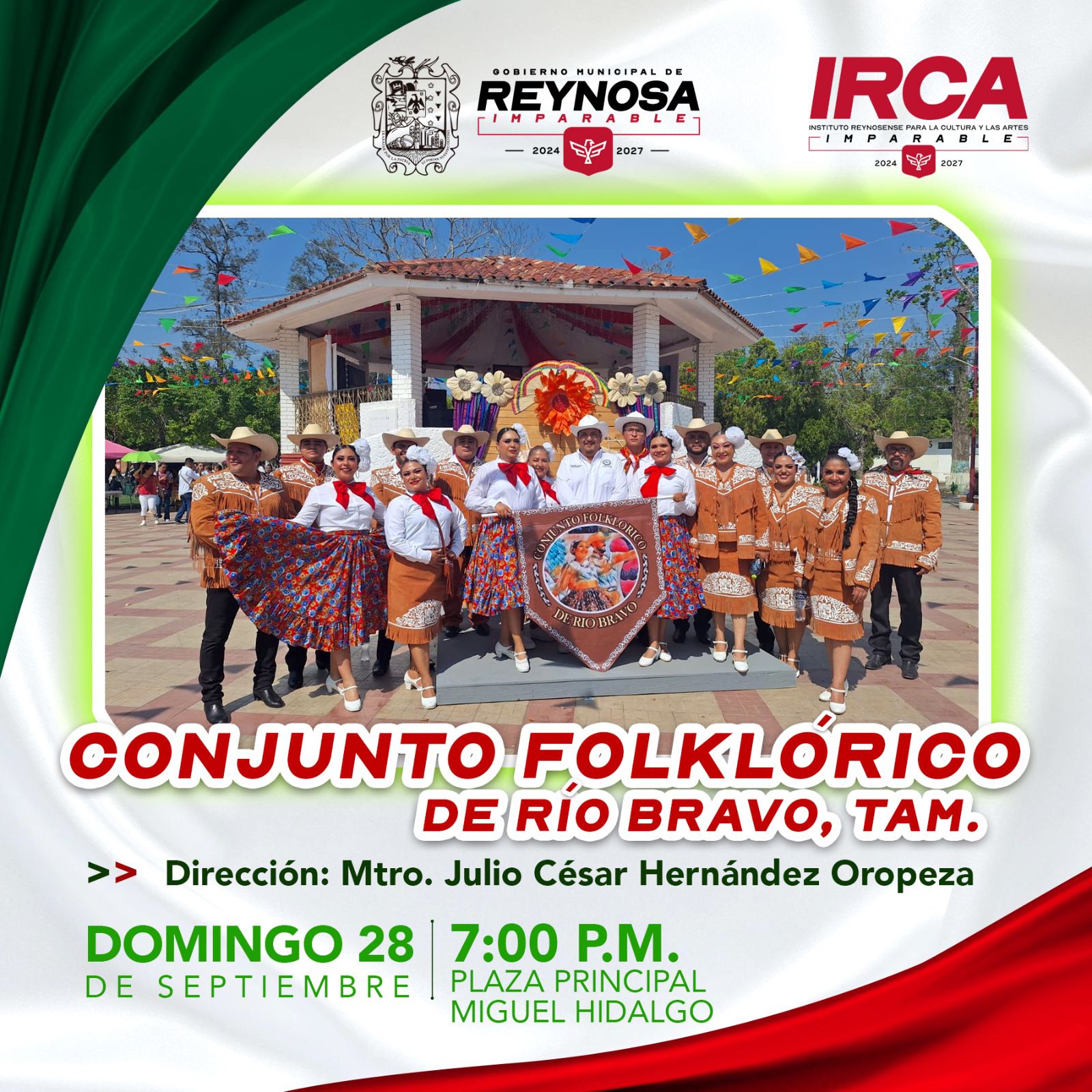 A las 19:00 horas, el Conjunto Folklórico de Río Bravo, dirigido por el Maestro Julio César Hernández Oropeza, pisará el mismo escenario para presentar cuadros tradicionales de México.