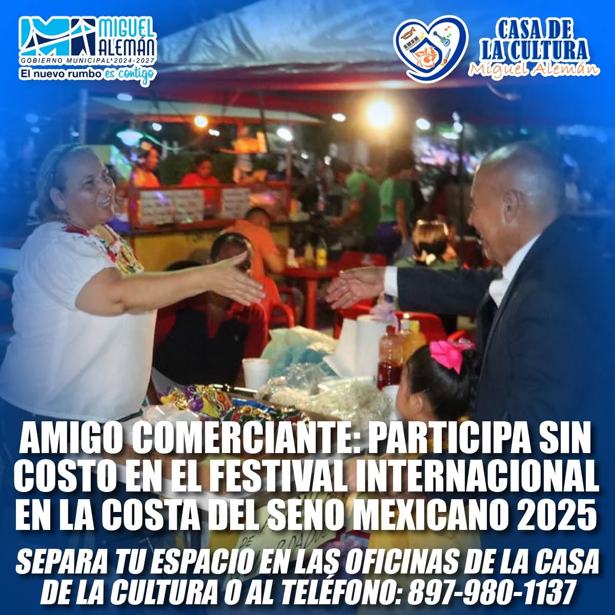 MIGUEL ALEMÁN, TAM. – El Gobierno del Biol. Ramiro Cortez Barrera, a través de la Secretaría de Educación, Cultura y Deporte, invita a todos los comerciantes locales a participar en el XXXII Festival Internacional en la Costa del Seno Mexicano con la venta de antojitos mexicanos y otros productos, sin costo alguno.