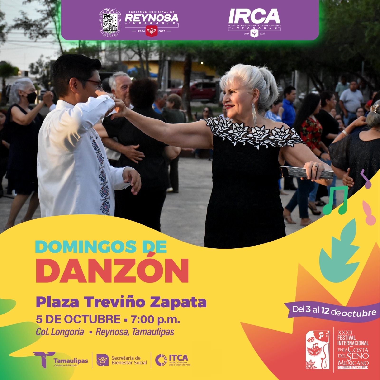 Siguiendo las instrucciones del Alcalde Carlos Peña Ortiz, el Instituto Reynosense para la Cultura y las Artes ofrece clases gratuitas de danzón cada domingo en la plaza Treviño Zapata a partir de las 7:00 P. M.