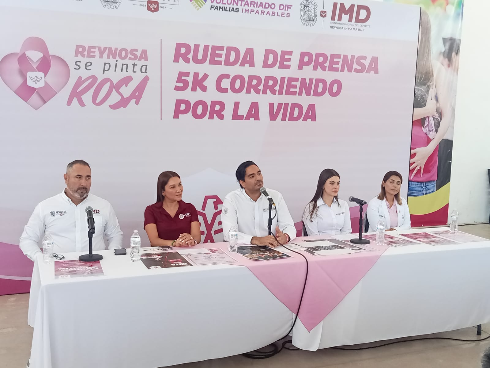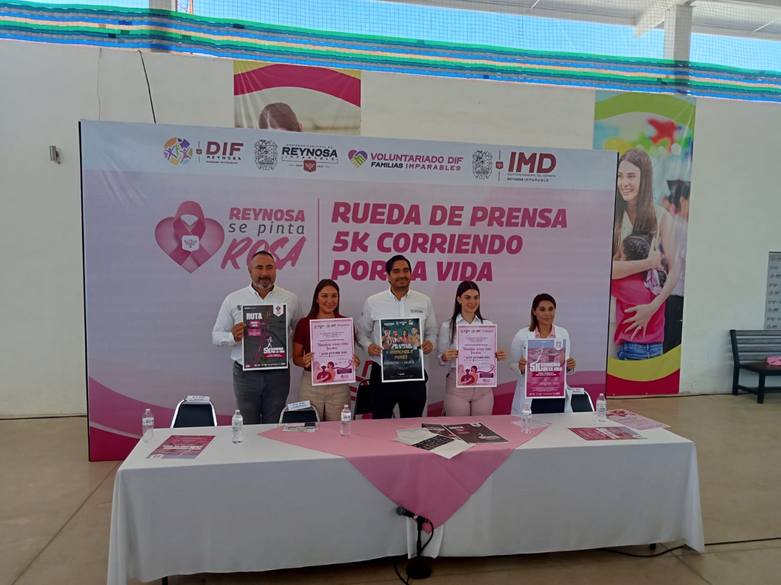 El Alcalde de Reynosa, Carlos Peña Ortiz, encabezó este lunes una conferencia de prensa en las instalaciones del Sistema DIF Municipal, donde, junto con la directora general del organismo, Gaby Garza, la presidenta del voluntariado, Alejandra Garza, y el director del Instituto Municipal del Deporte, Saúl Soto Castro, dio a conocer el arranque de las actividades del Mes Rosa, dedicado a la lucha contra el cáncer de mama.