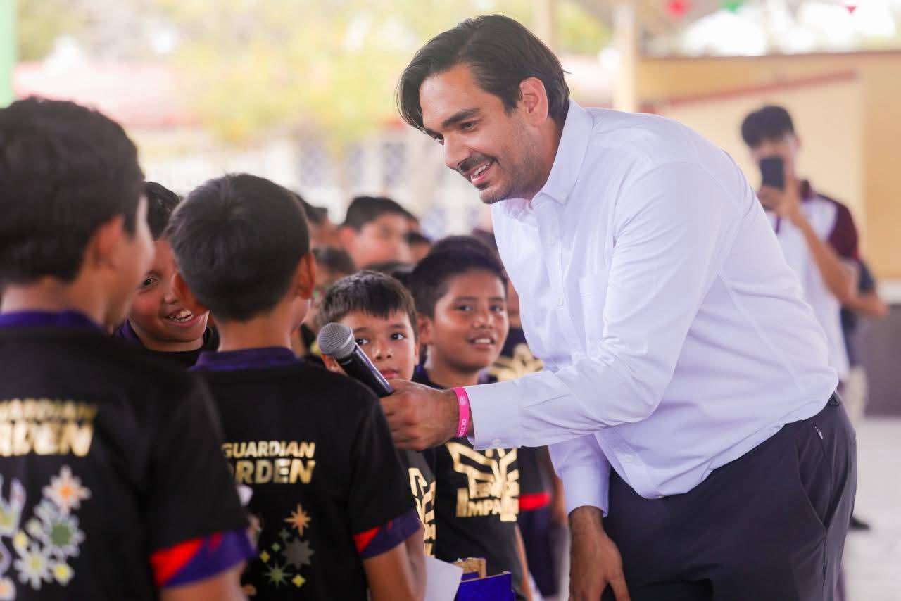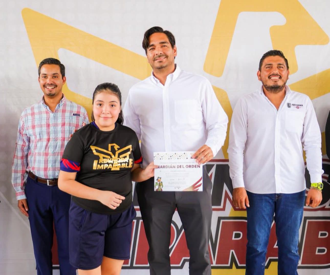 «El día de hoy ya son Guardianes del Orden, aprendieron a cuidar el medio ambiente, no tirar basura; todo eso es importante para nuestra ciudad, debemos evitar que haya quien tire basura en lugares clandestinos porque debe ir en el basurero o el contenedor, gracias por ayudar», dijo el Alcalde a la emocionada comunidad escolar de la Primaria Moctezuma.