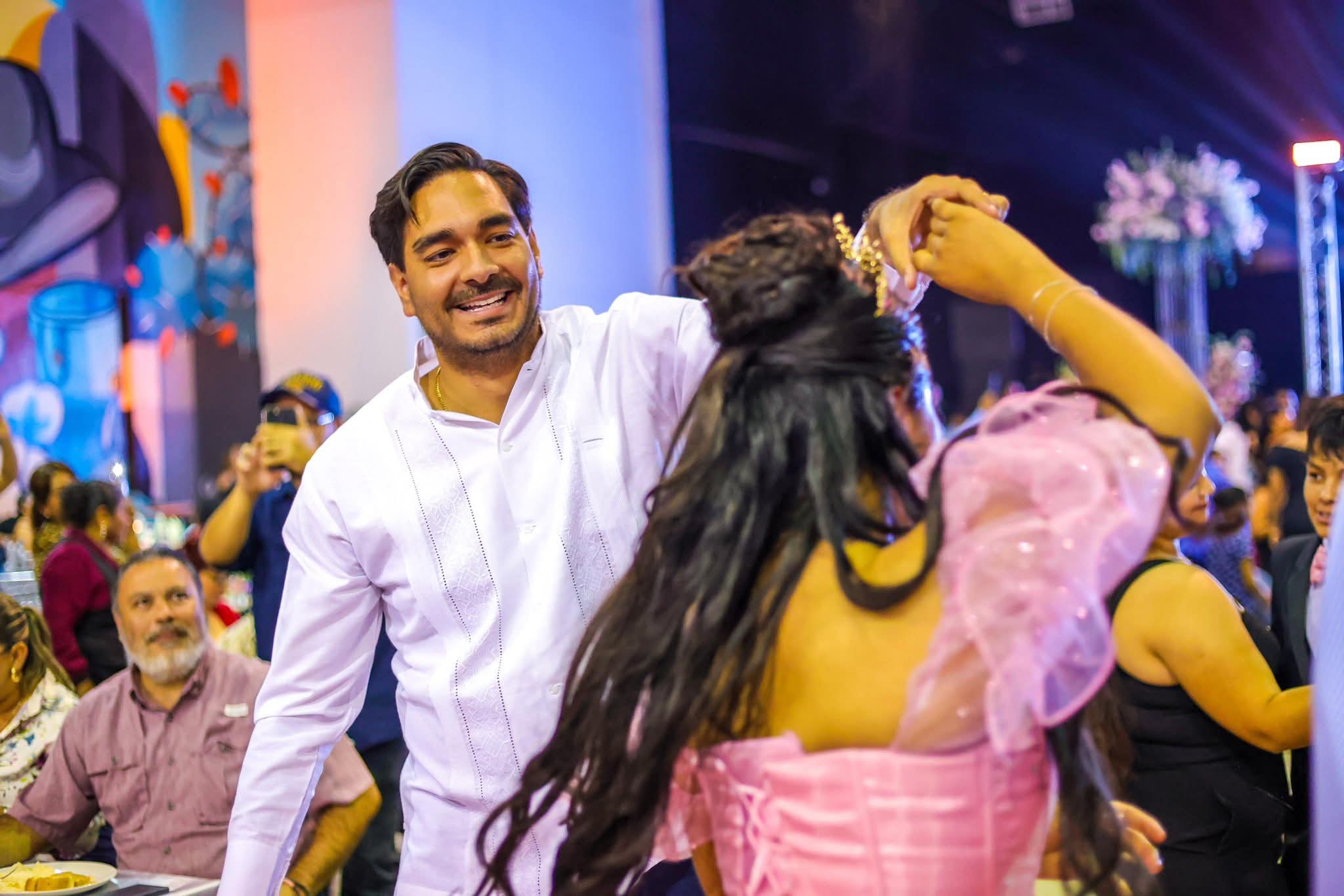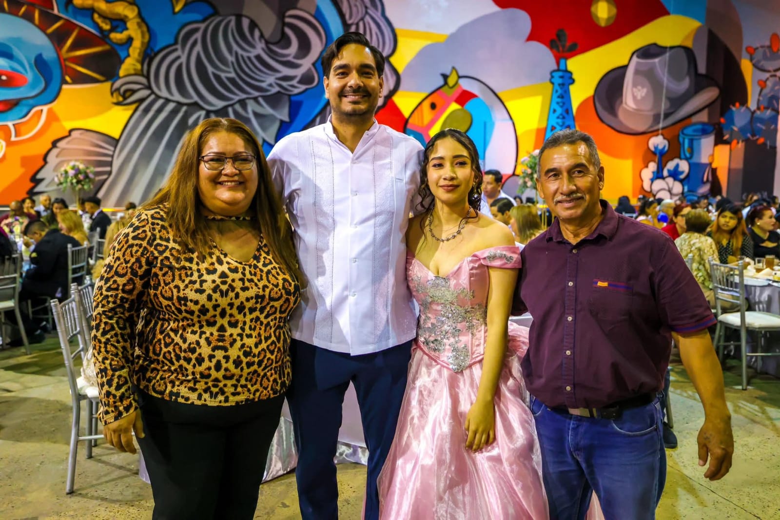«Mis Quince»; el Presidente Municipal Carlos Peña Ortiz y su esposa Alejandra Yelitza Garza, acompañados por la Diputada Federal Casandra Priscila de los Santos Flores, felicitaron a 82 jóvenes y señoritas que celebraron su fiesta en la edad de las ilusiones, un evento en el que convivieron con ellos y sus familias disfrutando también de un banquete especial en el Auditorio Municipal.