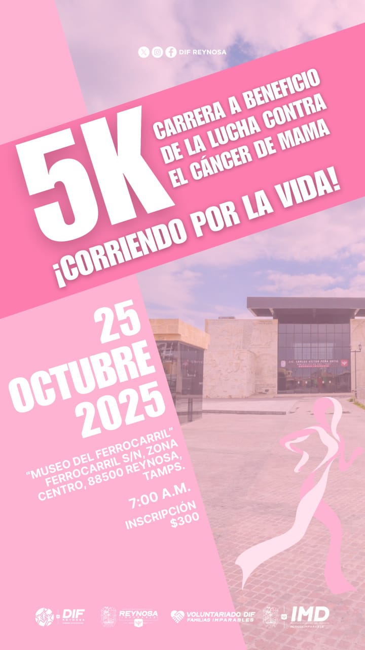 El Alcalde Carlos Peña Ortiz, continúa haciendo la invitación a toda la ciudadanía a participar en la carrera 5K Corriendo por la Vida, organizada por el Sistema DIF Reynosa, la cual se llevará a cabo este sábado 25 de octubre a las 7:00 de la mañana, teniendo como punto de partida el Museo del Ferrocarril.