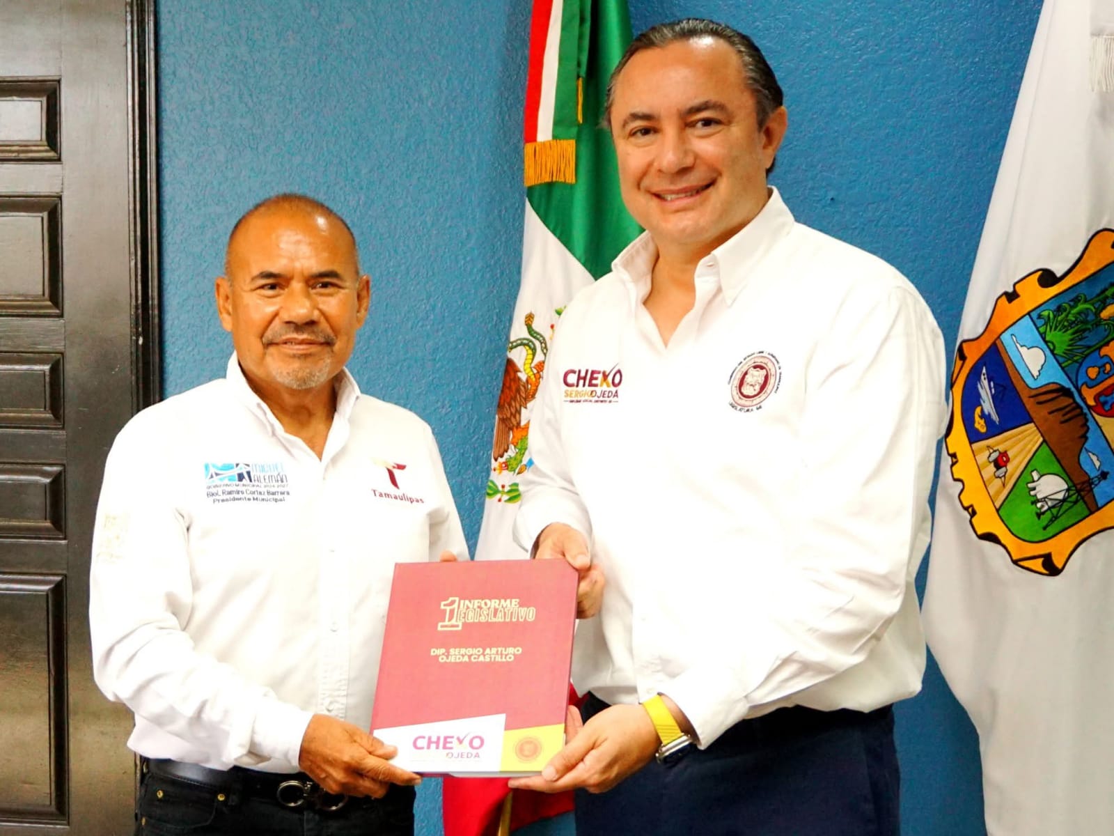 MIGUEL ALEMÁN, TAM. – Este lunes, el Presidente Municipal Biol. Ramiro Cortez Barrera, recibió en su despacho al Diputado Local por el Distrito III de Tamaulipas, Lic. Sergio Ojeda Castillo, quien le hizo entrega de su Primer Informe Legislativo como parte de un recorrido que realizó por los municipios que representa.