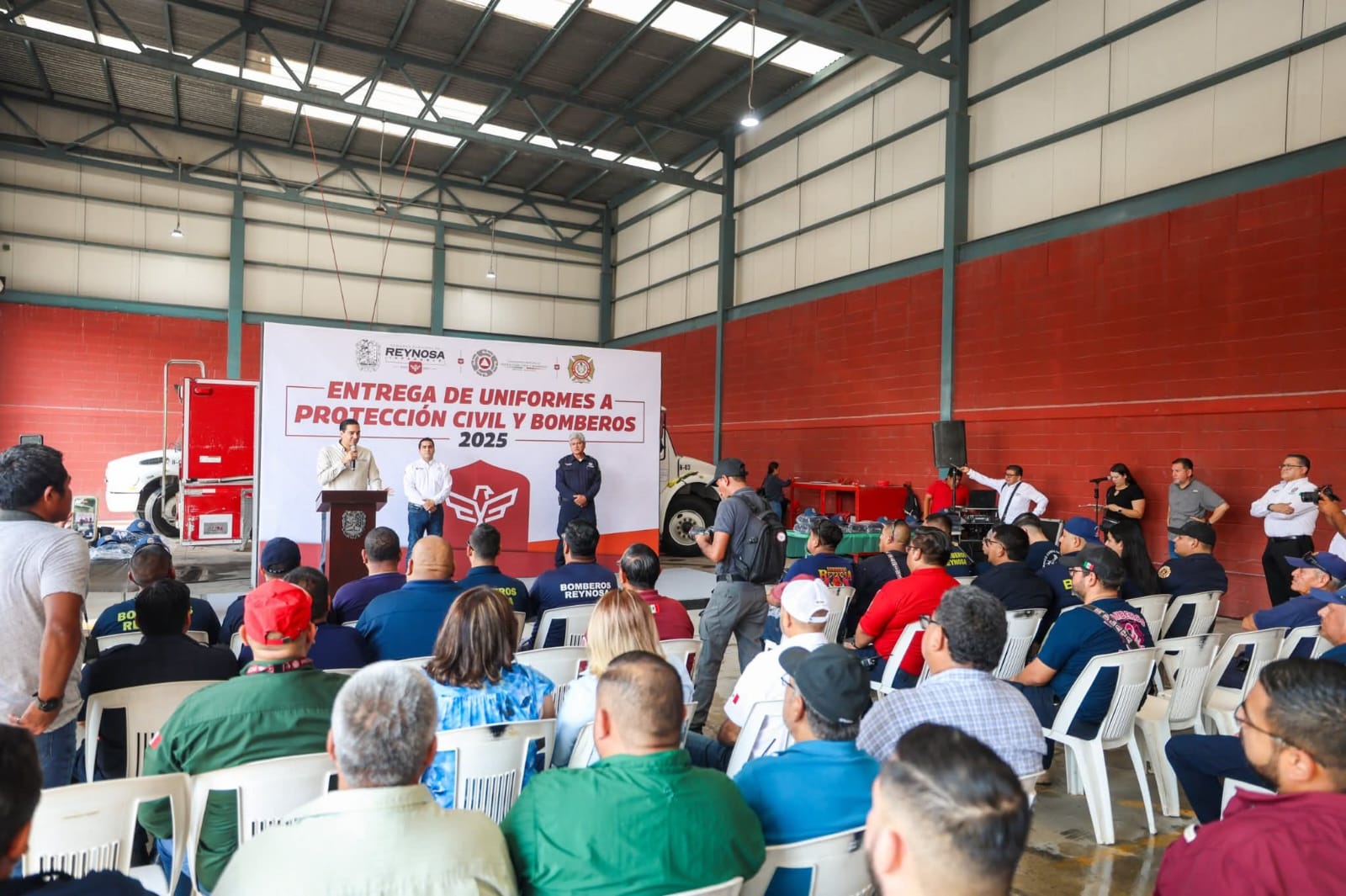 El Presidente Municipal, Carlos Peña Ortiz, encabezó una emotiva ceremonia, con la presencia de Javier Iván Lam Cantú, en la que entregó equipo de protección a los elementos de su corporación, Protección Civil y Bomberos de Reynosa, Los equipos entregados incluyen: