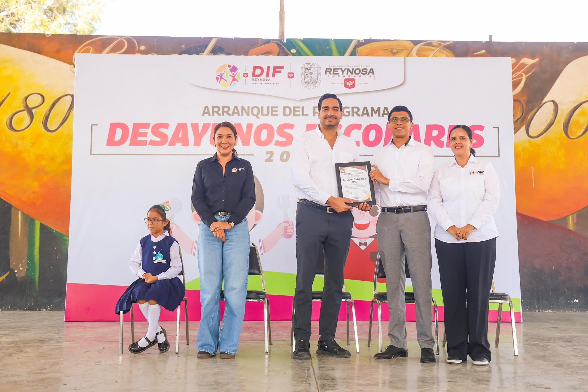 El Alcalde Carlos Peña Ortiz, en compañía del Presidente del Patronato del DIF-Reynosa, Carlos Luis Peña Garza, inauguró el programa de Desayunos Escolares 2025, con el Director de la escuela primaria Benito Juárez, Profr. Emmanuel Martínez Hernández, quien le entregó un Reconocimiento por su invaluable apoyo.