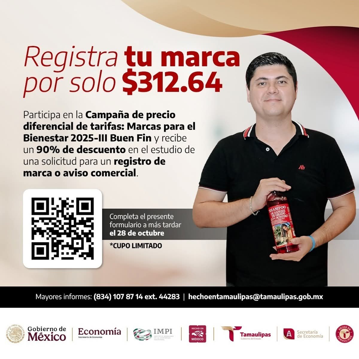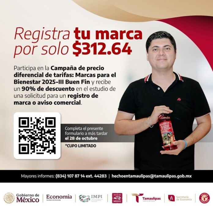 Esta Campaña, impulsada por el Instituto Mexicano de la Propiedad Industrial (IMPI), a través del programa Hecho en Tamaulipas de la Secretaría de Economía, brinda una reducción del 90% en la tarifa correspondiente al estudio de una solicitud nacional para el registro de una marca, aviso comercial o nombre comercial.