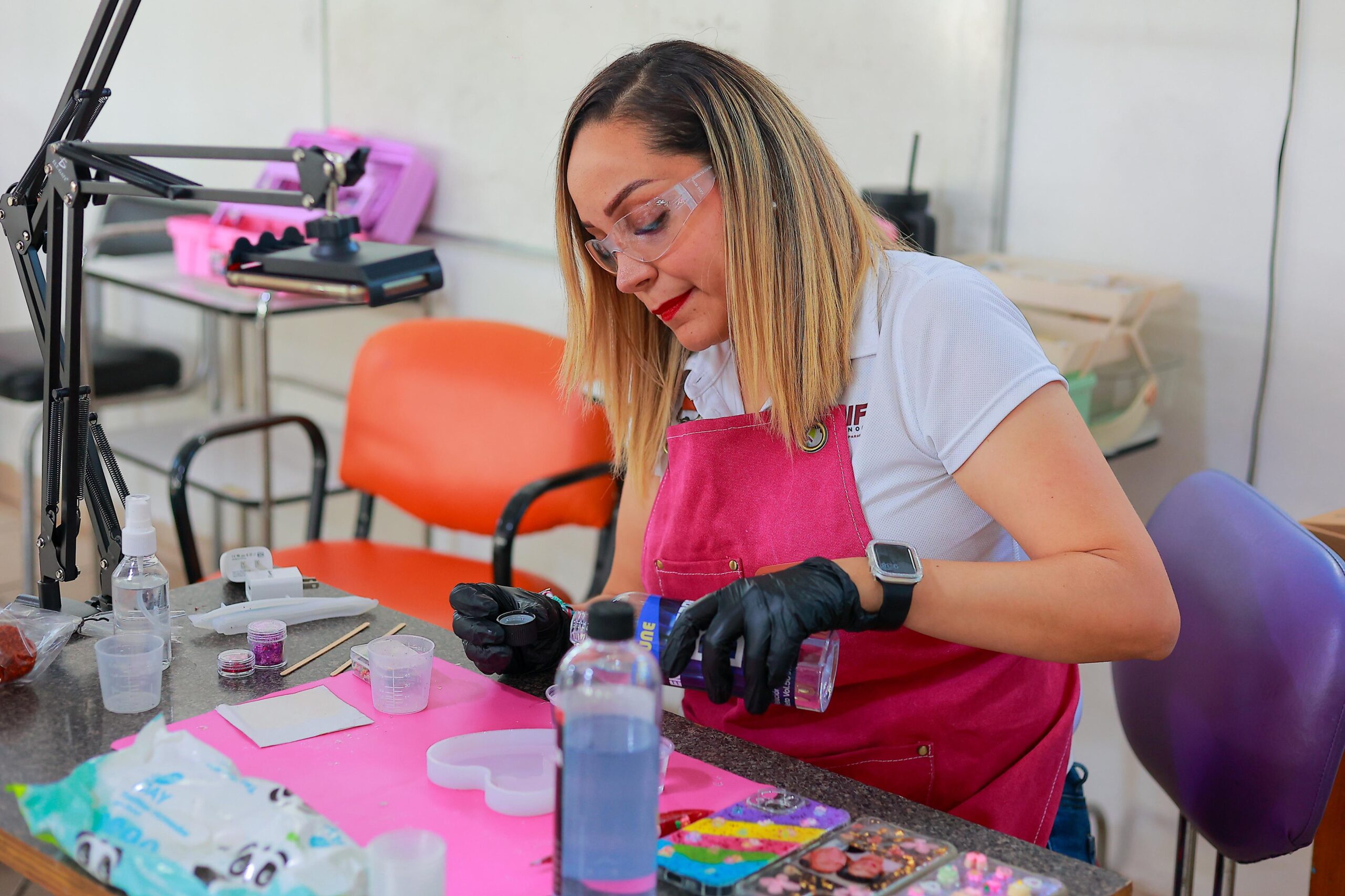 Entre las opciones formativas se encuentra el taller de resina epóxica, una alternativa que permite a las participantes transformar su talento en oportunidades de emprendimiento, generando productos creativos como llaveros, fundas para celulares, plumas, aretes, collares, anillos y más, que con la capacitación pueden ir mejorando la técnica y creando más productos.