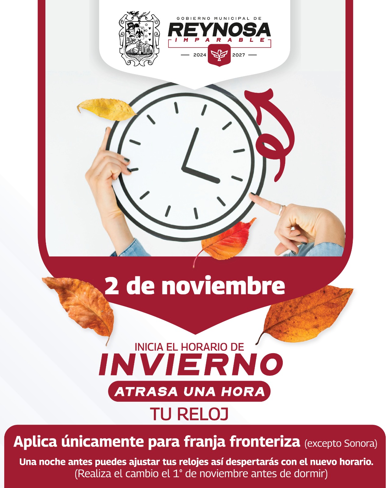 En Reynosa volvemos a la hora que rige a la mayor parte del país, y este domingo es el cambio que por comodidad puedes adelantar la noche de hoy, ajusta tus relojes y revisa tus dispositivos electrónicos, el Gobierno Municipal de Reynosa te desea un excelente domingo.