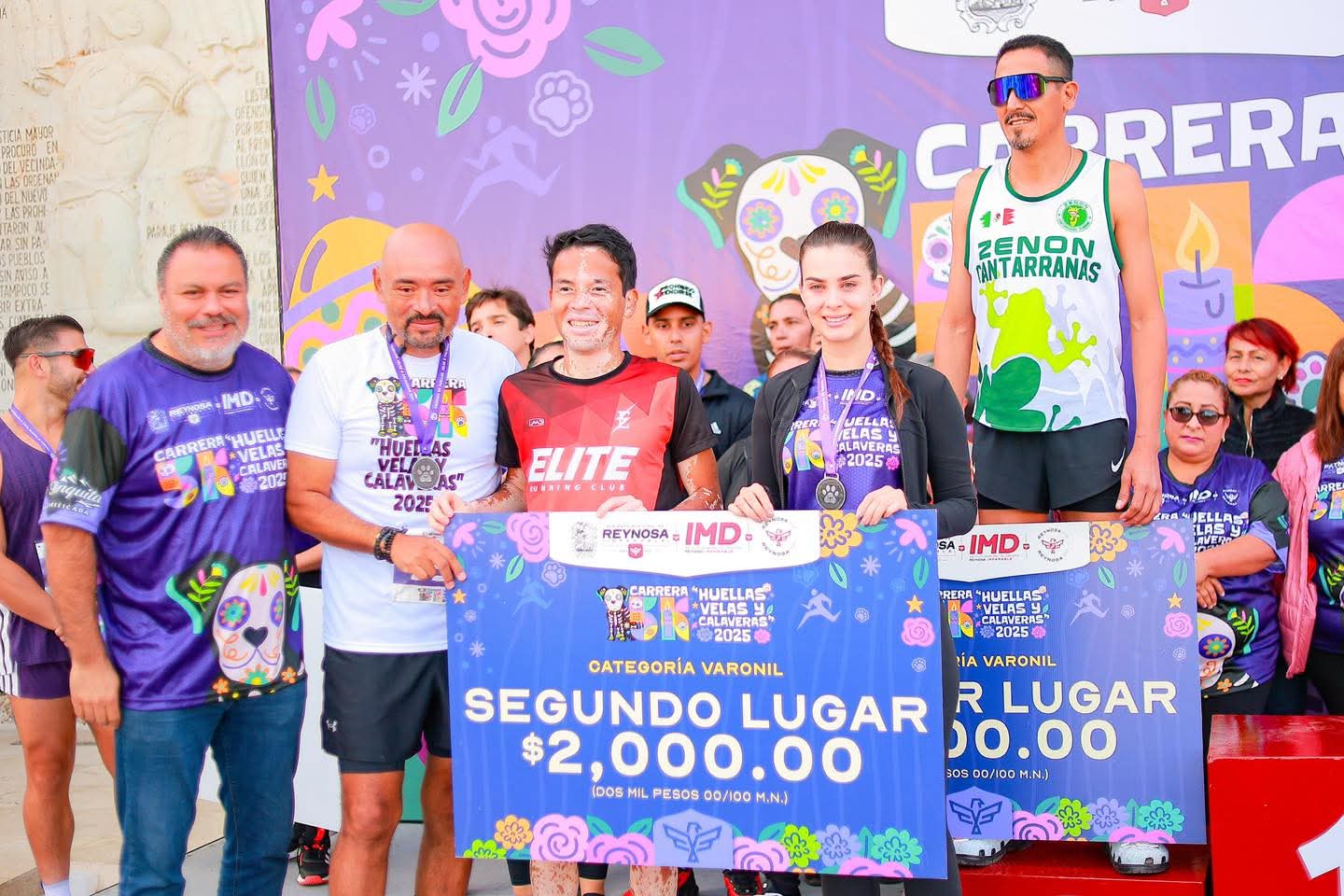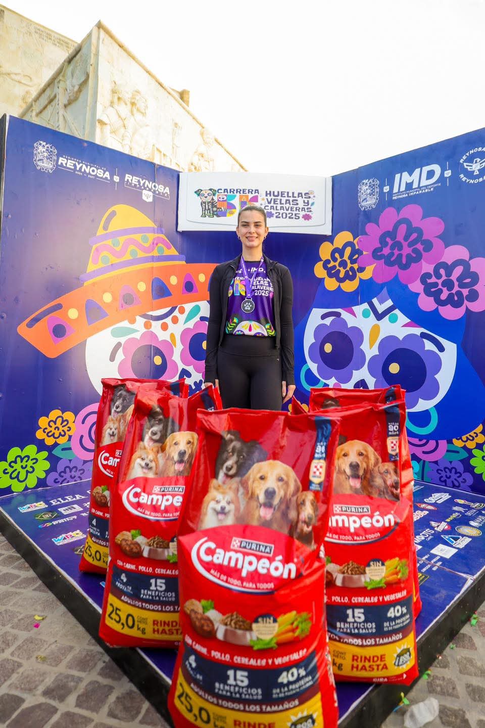 La Presidenta del Voluntariado DIF-Reynosa, Alejandra Yelitza Garza, en representación del Alcalde, felicitó a los competidores de la Carrera Huellas, Velas y Calaveras, que con total éxito fue celebrada este domingo con la participación de 600 corredores, que reunieron más de 10 toneladas de alimento para perros y gatos, contando con un importante donativo de Brandon Lara, Subdirector del Instituto Nacional de Pueblos Indígenas, quien participó en el evento.