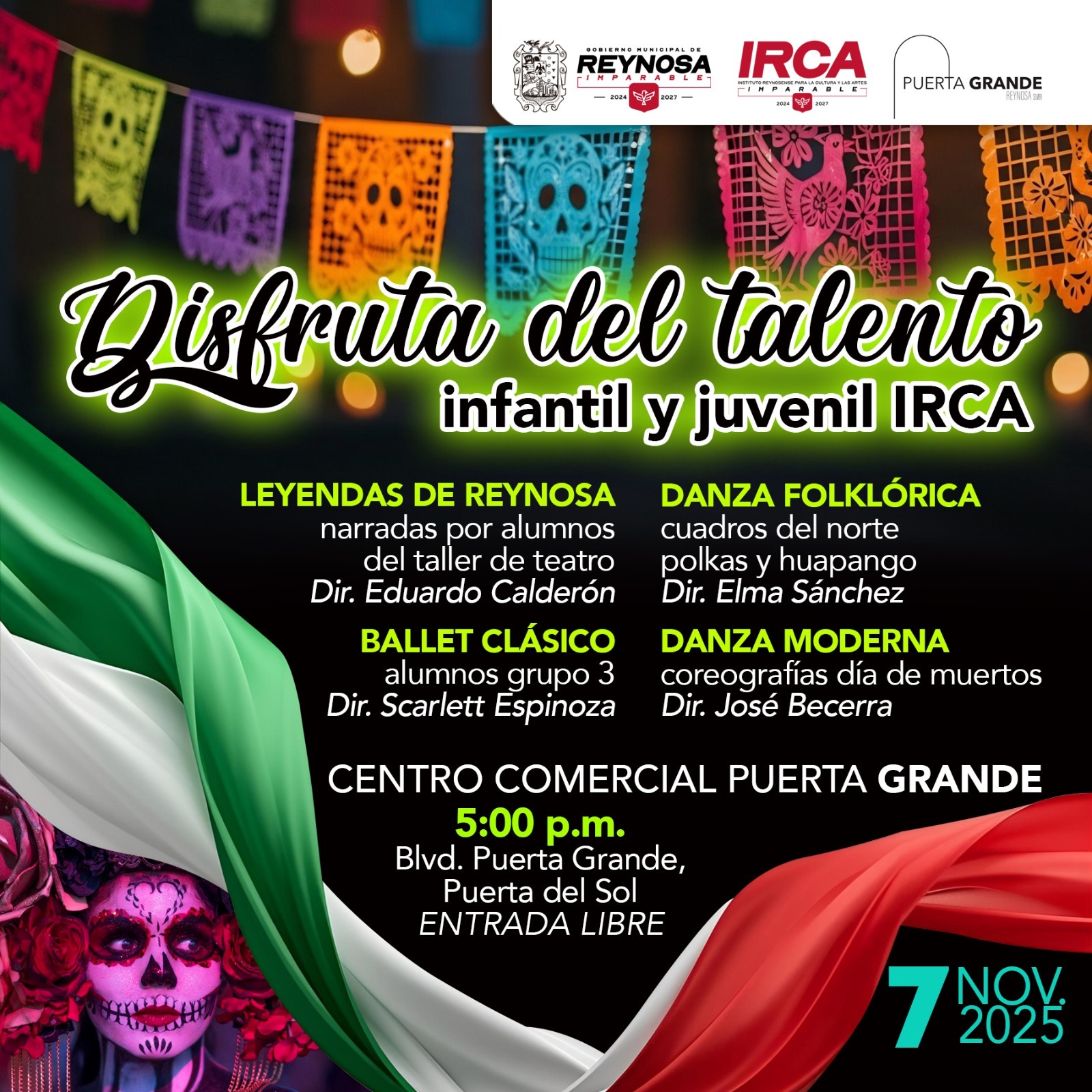 El Gobierno de Reynosa, que preside Carlos Peña Ortiz, invita al público a disfrutar de una muestra artística protagonizada por niñas, niños y jóvenes del Instituto Reynosense para la Cultura y las Artes, IRCA, el próximo viernes 7 de noviembre a las 5:00 P. M. en el centro comercial Puerta Grande, con entrada libre.
