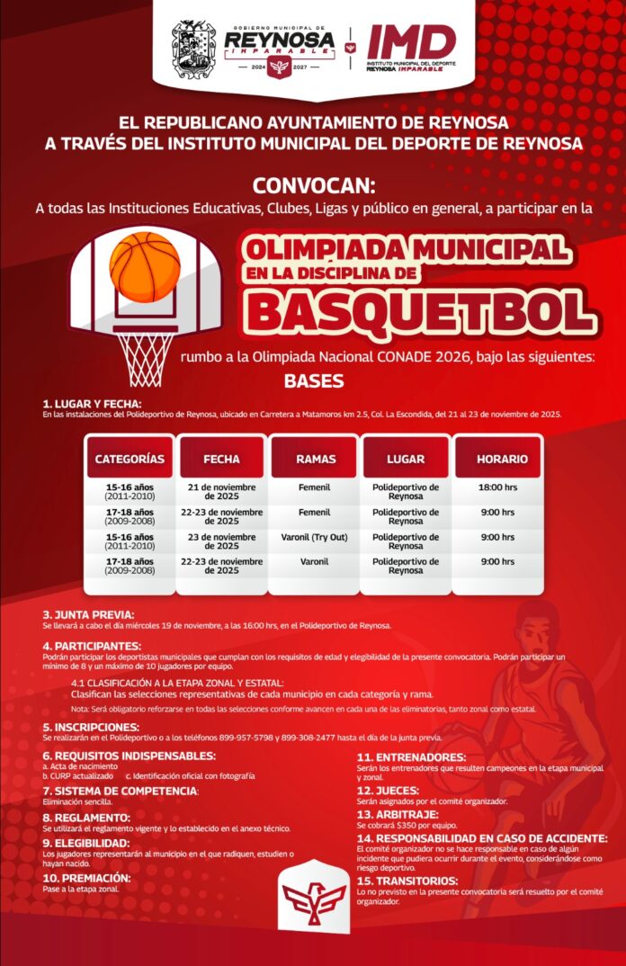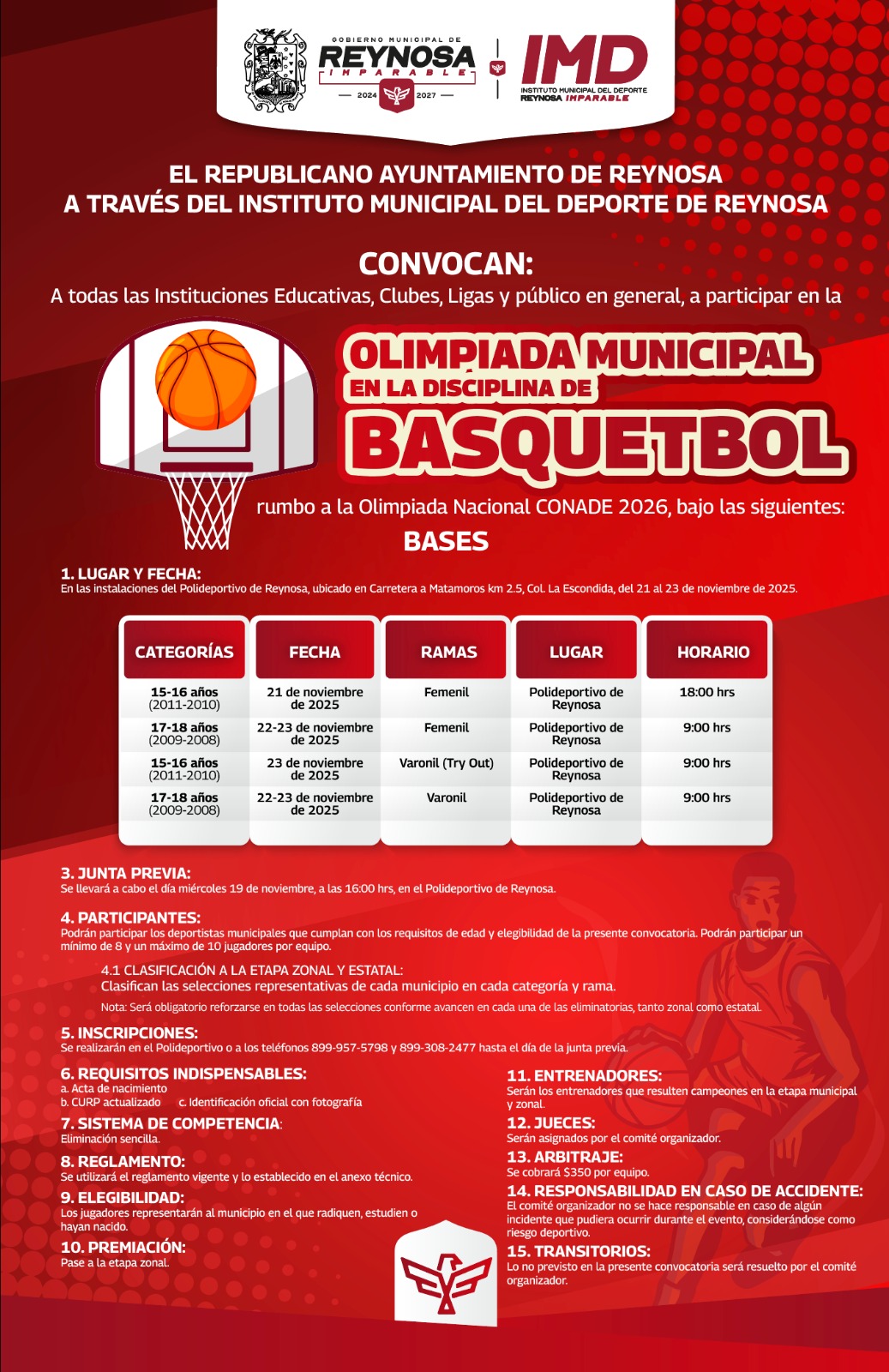 El Alcalde Carlos Peña Ortiz hace una atenta invitación a todas las instituciones educativas, clubes, ligas y al público en general, a participar en la Olimpiada Municipal en la disciplina de Basquetbol, rumbo a las Olimpiadas Nacionales CONADE 2026, a través del Instituto Municipal del Deporte.