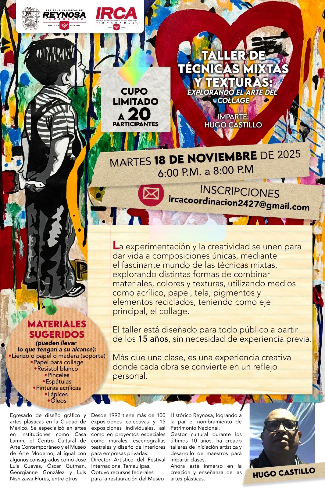 Por instrucciones del Alcalde Carlos Peña Ortiz, el Instituto Reynosense para la Cultura y las Artes convoca al Taller de Técnicas Mixtas y Texturas “Explorando el Arte del Collage”, impartido por el artista Hugo Castillo.