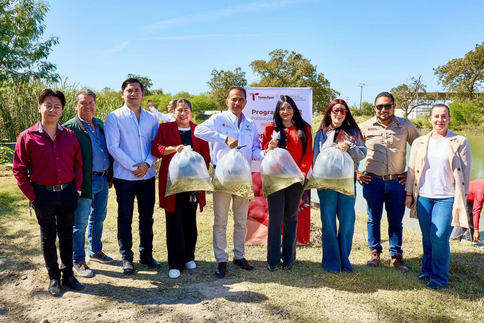 Díaz Ordaz, Tam. – En un esfuerzo conjunto por fortalecer la pesca deportiva y promover el aprovechamiento sustentable de los recursos naturales, la alcaldesa Nataly García Díaz encabezó la siembra de cuatro mil alevines en la laguna de COMAPA, acompañada por el Subsecretario de Pesca y Acuacultura de Tamaulipas, Jorge de Jesús Montagner Mendoza, el Director de Extensionismo Pesquero, Celestino Martínez Bernal, y el Director de Desarrollo Rural, Jaime Eduardo Chavana Ruvalcaba.