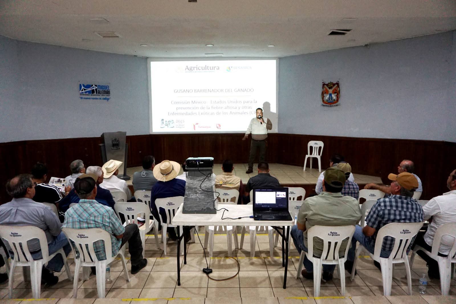 La Asamblea Informativa sobre el Gusano Barrenador se realizó este jueves en la Sala Audiovisual de la Presidencia Municipal, asistiendo productores pecuarios de Miguel Alemán que escucharon atentos la interesante plática sobre Revisión, Control y Previsión que ofreció el veterinario asignado por la Secretaría de Desarrollo Rural, Pesca y Acuacultura, MVZ Ricardo de Anda.