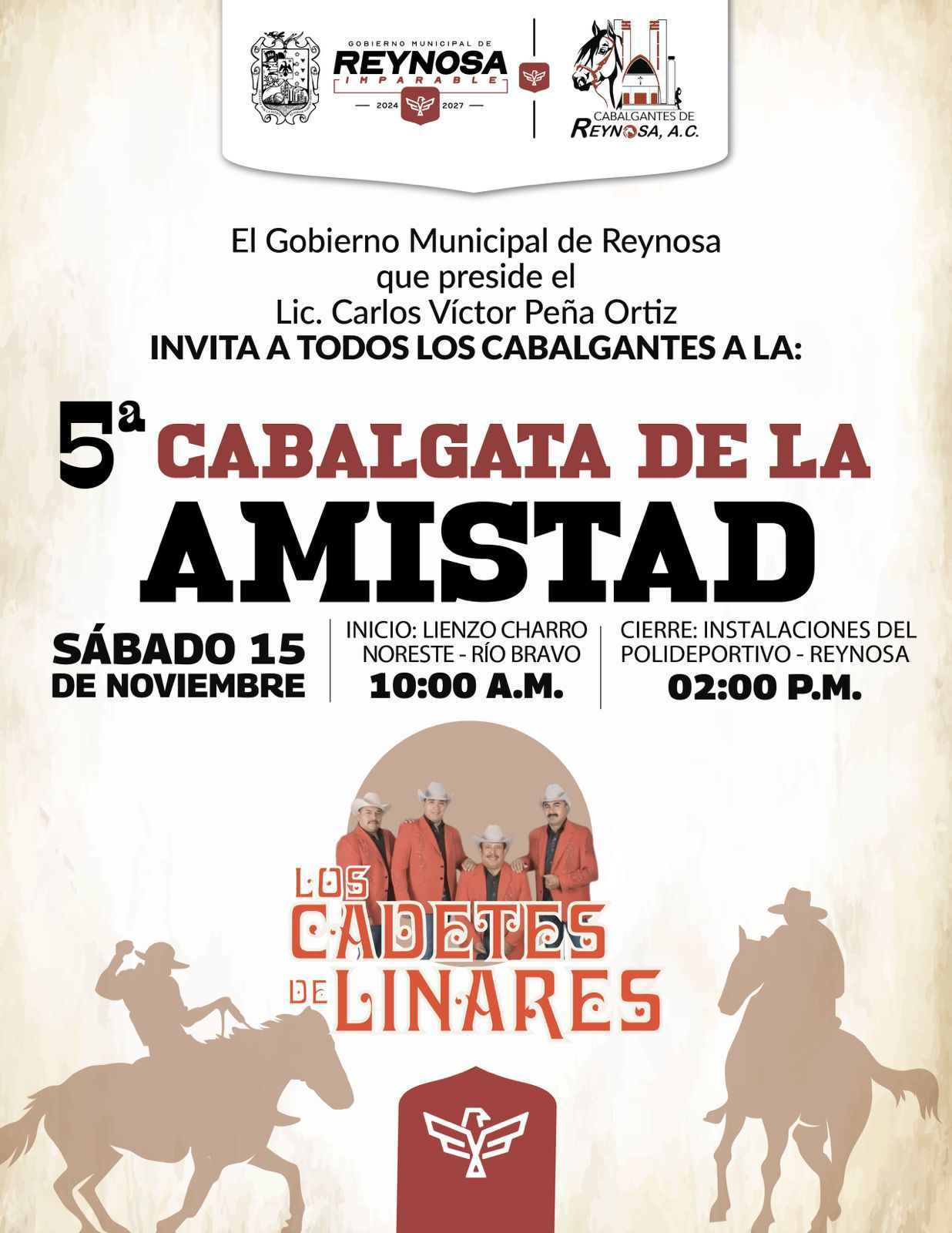 El Gobierno Municipal de Reynosa, que encabeza el Alcalde Carlos Peรฑa Ortiz, invita a todas y todos los cabalgantes a la Quinta Ediciรณn de la Cabalgata de la Amistad, celebrando la tradiciรณn y el orgullo del Norte de Tamaulipas.