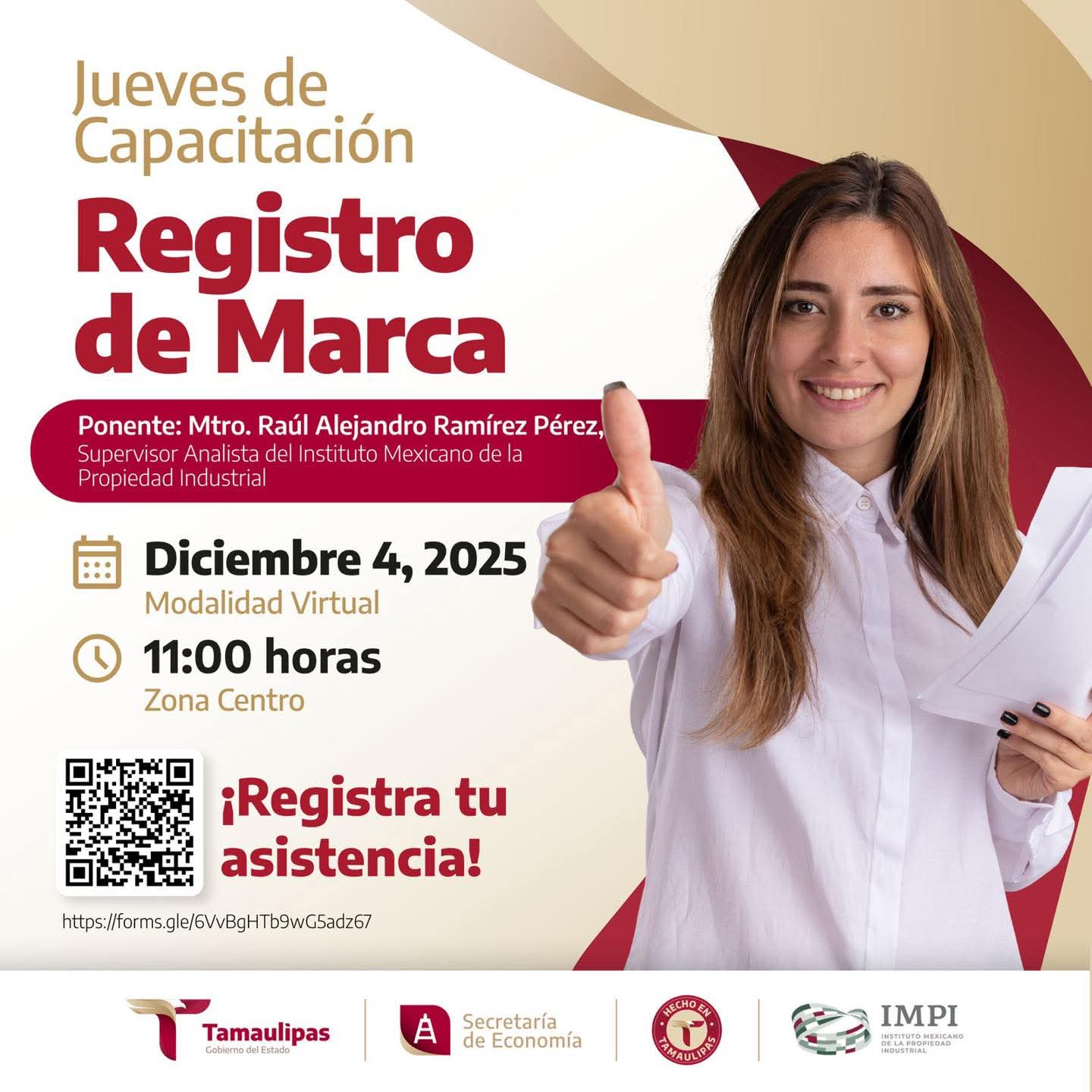 MIGUEL ALEMÁN, TAM. – El Gobierno del Biol. Ramiro Cortez Barrera invita a la capacitación “Registro de Marca” que ofrece la Secretaría de Economía a través del Programa Hecho en Tamaulipas, y en colaboración con el Instituto Mexicano de la Propiedad Industrial (IMPI).