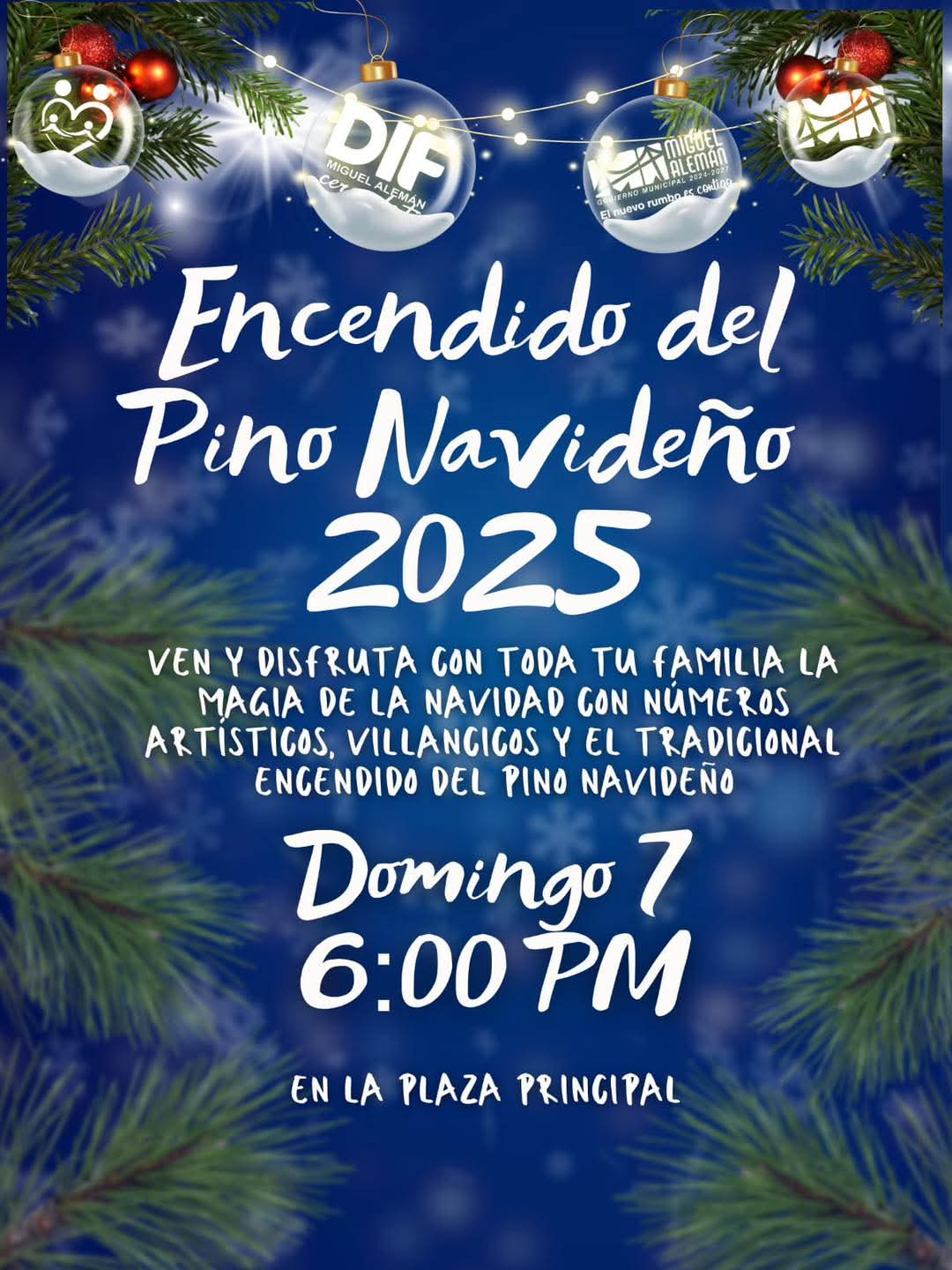 MIGUEL ALEMÁN, TAM. – El Gobierno Municipal, encabezado por el alcalde Biólogo Ramiro Cortez Barrera, anunció la invitación abierta a todas las familias para asistir al tradicional encendido del Pino Navideño, que se llevará a cabo este domingo 7 de diciembre en la explanada de la Presidencia Municipal.