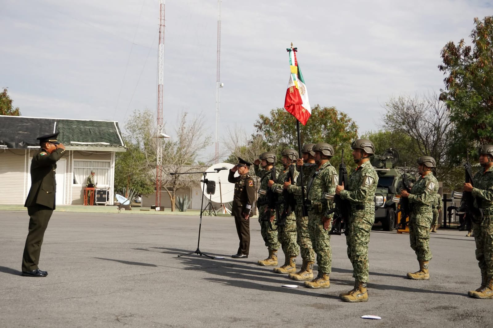 H. CIUDAD MIER, TAM. – El Gobierno del Biol. Ramiro Cortez Barrera, por conducto del regidor C. Oscar Luis Sandoval Nieves, felicitó este sábado al Coronel Fidel Hernández Hernández en la ceremonia de Protesta de Bandera y Toma de Posesión del Cargo como nuevo Comandante del 25/o. Regimiento de Caballería Motorizado.