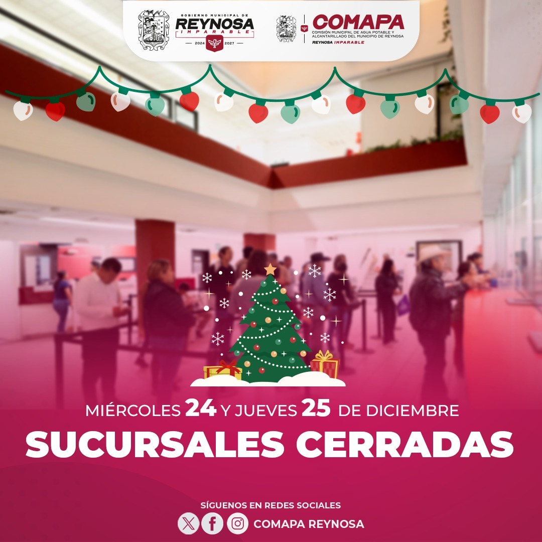 La Comisión Municipal de Agua Potable y Alcantarillado de Reynosa informa a los usuarios que, con motivo de las festividades navideñas, las sucursales del organismo permanecerán cerradas los días miércoles 24 y jueves 25 de diciembre.