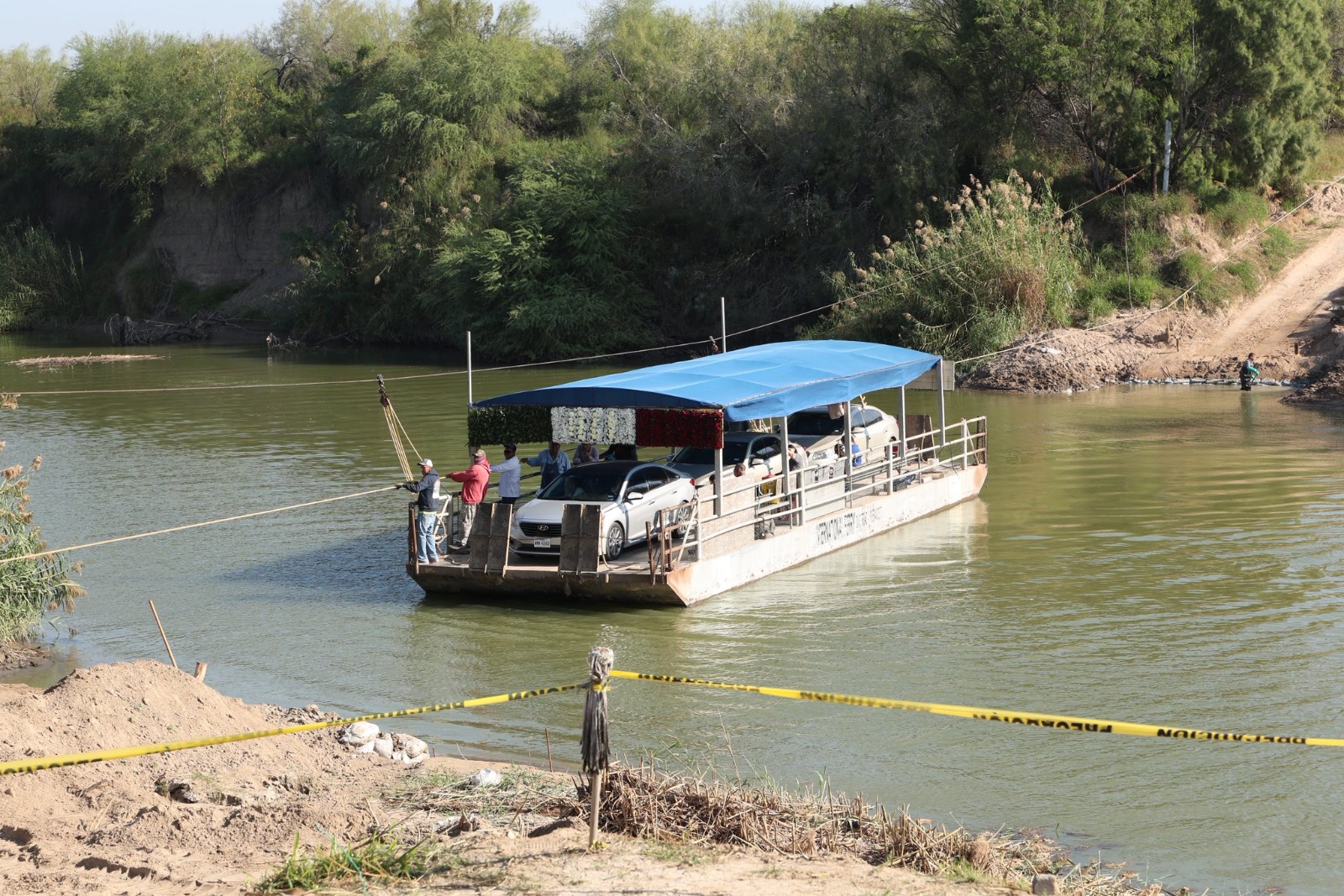 Gustavo Díaz Ordaz, Tam.- Por seguridad de los usuarios ante los fuertes vientos que se presentan en la región, se han suspendido las actividades en el cruce internacional donde se utiliza un chalán para el transporte de autos y peatones entre los Ébanos Texas y Díaz Ordaz, Tamaulipas.