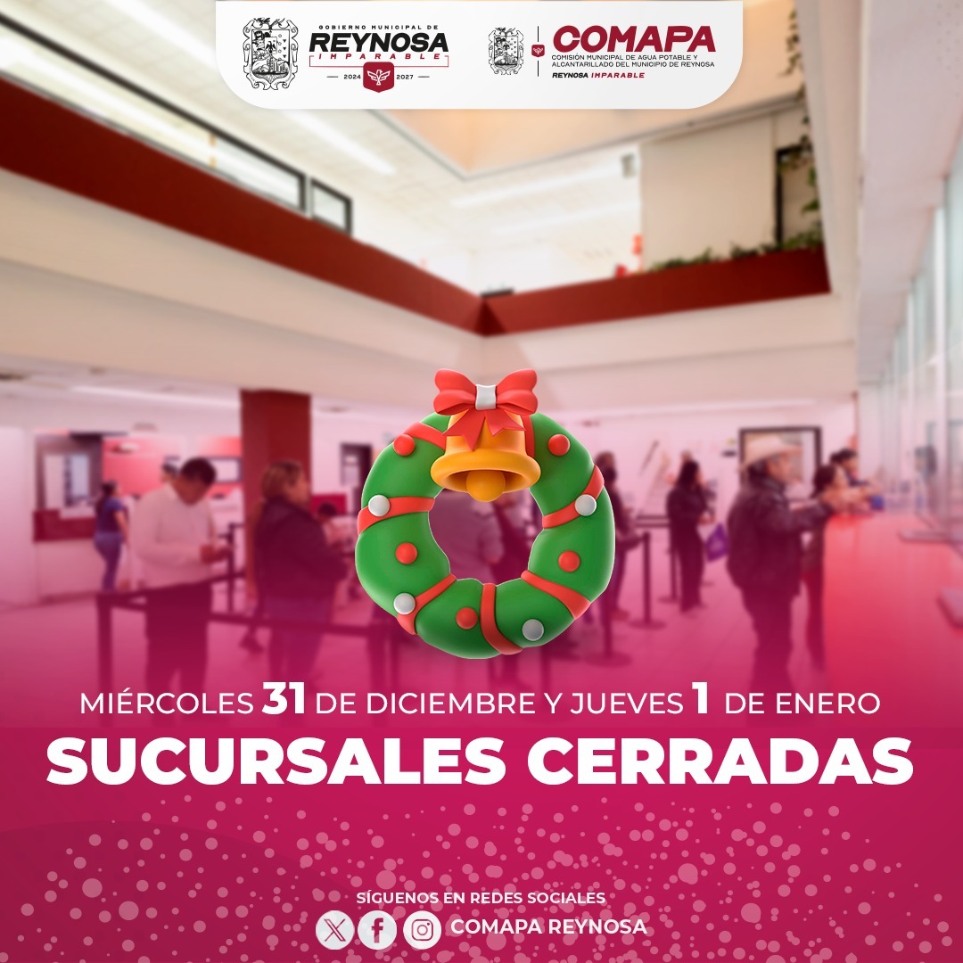 La Comisión Municipal de Agua Potable y Alcantarillado de Reynosa informa a los usuarios que, con motivo de las festividades de fin de año, las sucursales del organismo permanecerán cerradas los días miércoles 31 de diciembre y jueves 1 de enero.