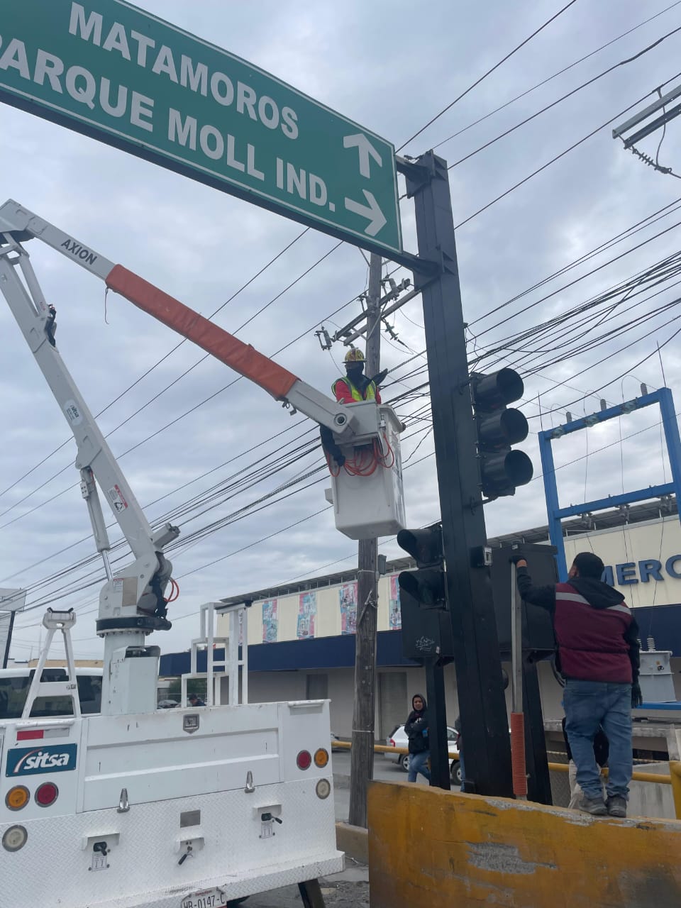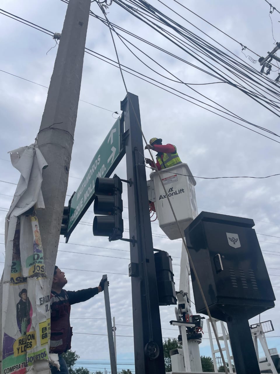 Técnicos de Vialidad y Semaforización instalaron cable calibre 8 para alimentación del semáforo del parque industrial Moll, con el objetivo de mejorar la circulación vehicular y garantizar la seguridad de los conductores y peatones.