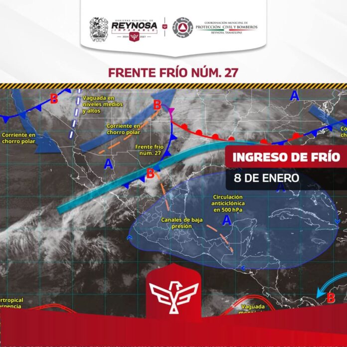 La Coordinación de Protección Civil y Bomberos, del Gobierno Municipal de Reynosa, informa que el Frente Frío Número 27 está causando un leve descenso en la temperatura hoy jueves 8 de diciembre a los 21° Centígrados, después de que durante el día la máxima habrá llegado a los 31° C. y el viernes 9 la posibilidad de 17° Grados Celsius como mínima.