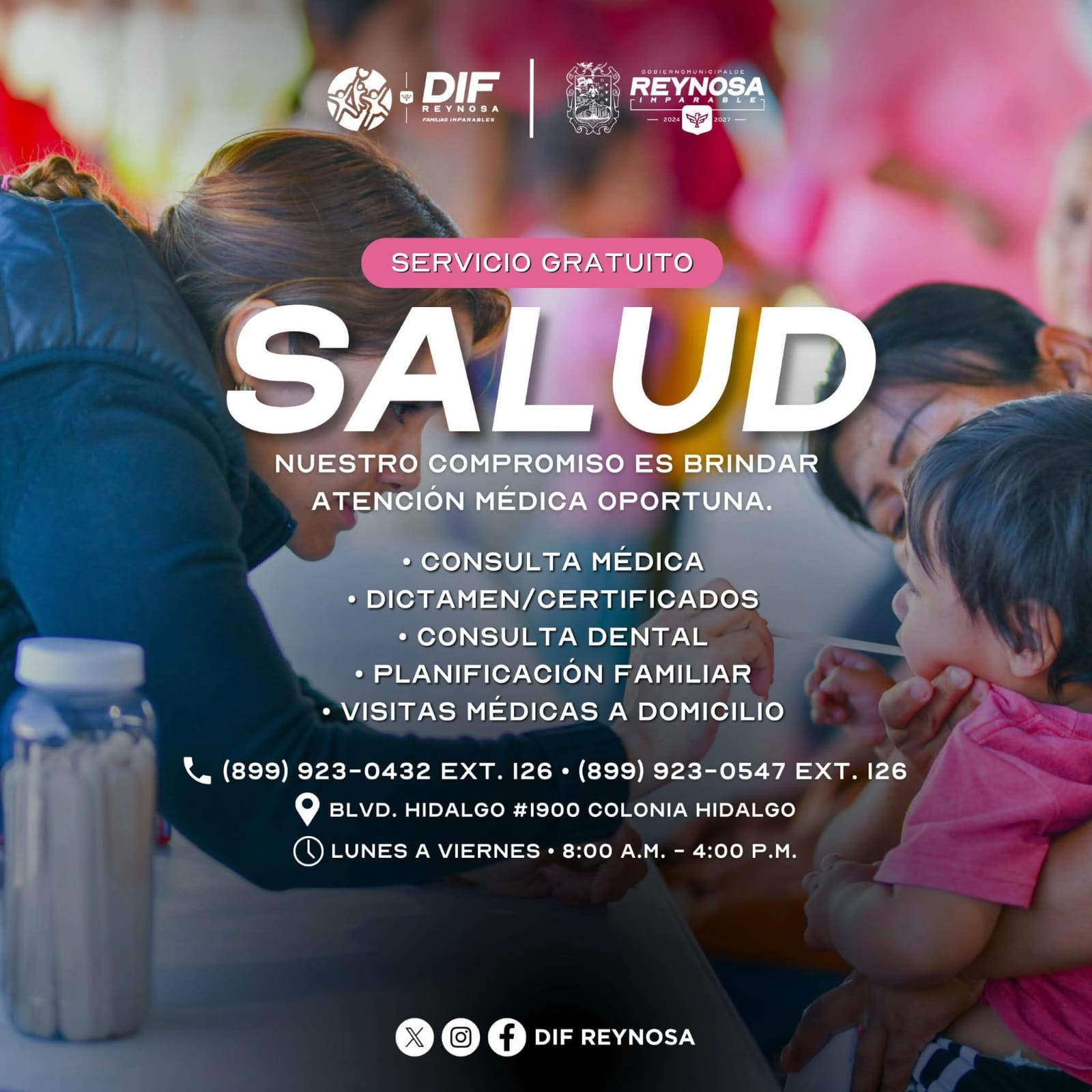 El Sistema DIF-Reynosa que preside Carlos Luis Peña Garza, mantiene a disposición de la población diversos servicios gratuitos de salud, con el objetivo de garantizar atención médica oportuna y contribuir al bienestar integral de las familias.
