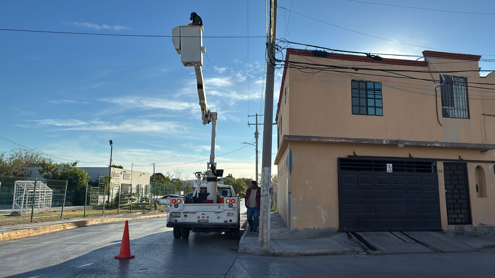 Asimismo, se atendieron acciones de reparación de alumbrado público en la colonia Los Muros, con la instalación de un brazo, fleje, hebillas, cableado y una nueva lámpara LED frente al Tamul de la calle Cero, reforzando la iluminación y la seguridad en la zona.