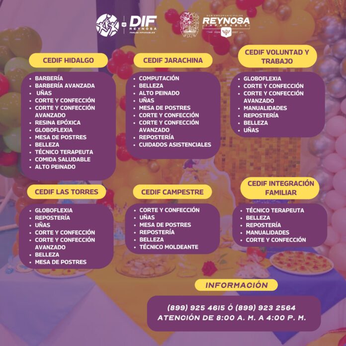 En los CEDIF Hidalgo, Jarachina, Voluntad y Trabajo, Las Torres, Campestre e Integración Familiar, los participantes tienen acceso a talleres como barbería, barbería avanzada, corte y confección, globoflexia, repostería, mesa de postres, belleza, uñas, alto peinado, resina epóxica, cuidados asistenciales, computación, manualidades, técnico terapeuta, técnico moldeante, comida saludable, entre otros.