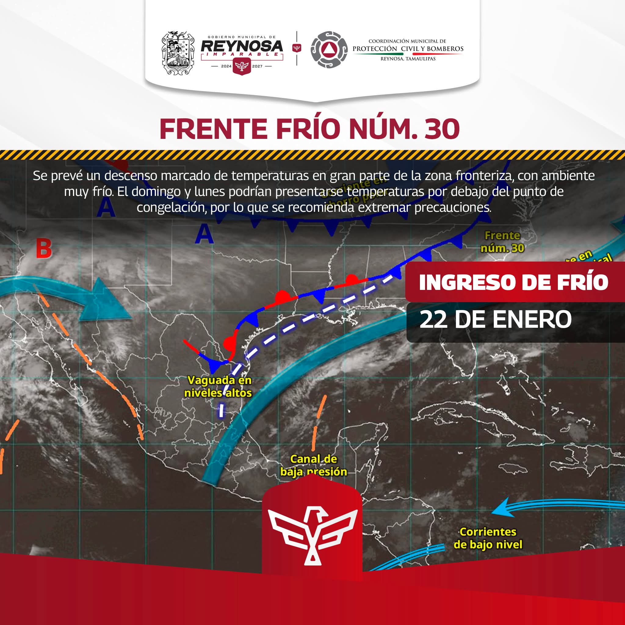 El Servicio Meteorológico Nacional mantiene vigilancia sobre el frente frío núm. 30, ubicado sobre la frontera norte del país, así como los efectos de un río atmosférico que afecta al noroeste de México.
