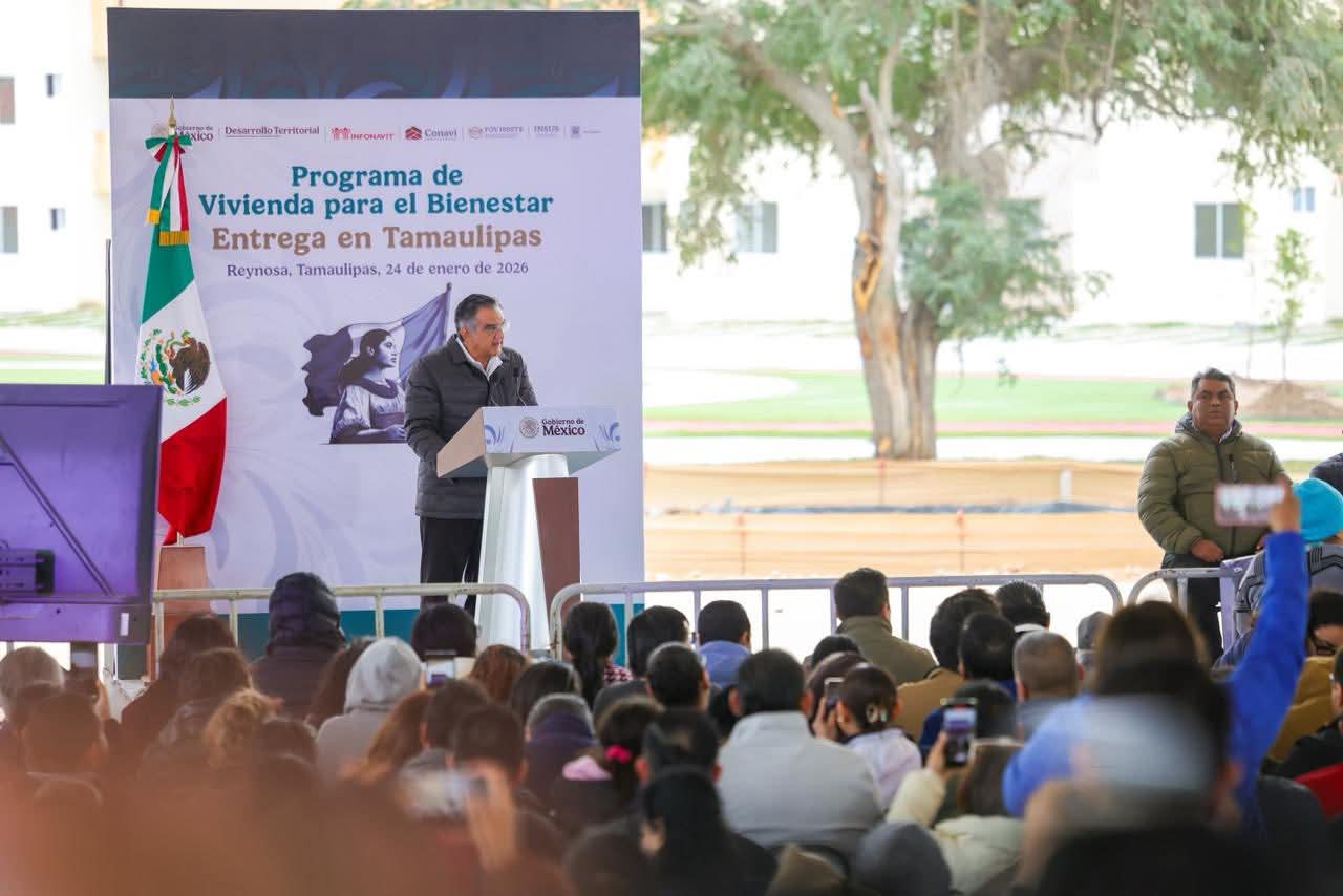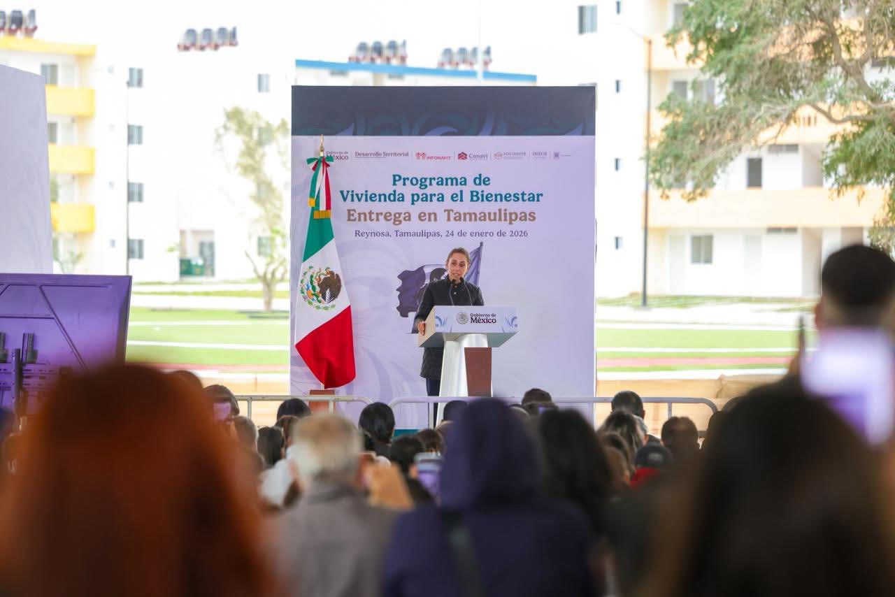 «Me da mucho gusto estar hoy aquí en Reynosa, Tamaulipas, para entregar beneficios de los programas del Gobierno de la República. Agradezco la presencia del Gobernador Constitucional de Tamaulipas, Doctor Américo Villarreal Anaya, y del Presidente Municipal de Reynosa, Carlos Peña Ortiz», dijo la Presidenta al encabezar la entrega de beneficios de programas federales, de Vivienda del Bienestar y Pensión para Mujeres Bienestar.