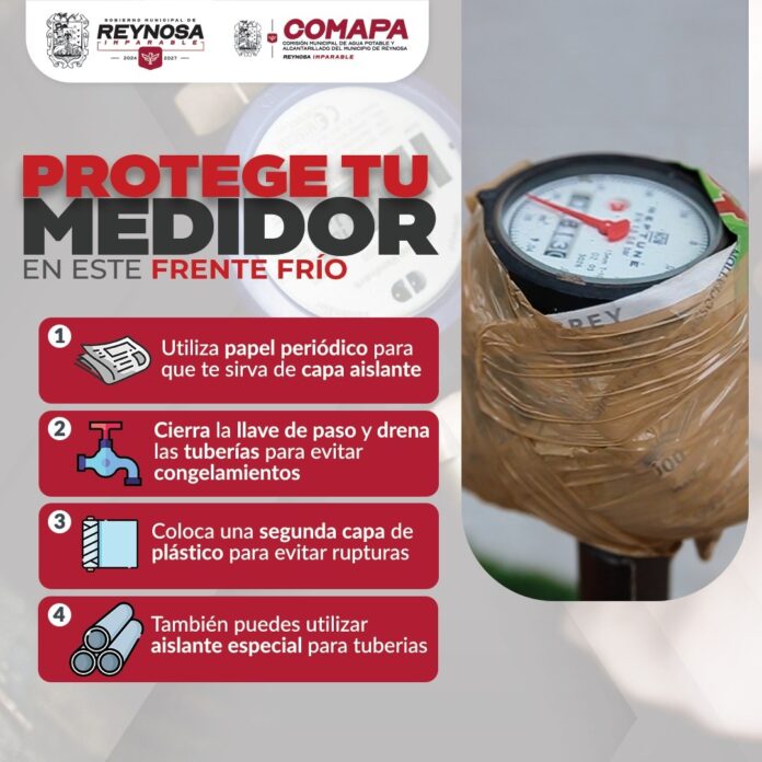 La Comisión Municipal de Agua Potable y Alcantarillado de Reynosa hace un llamado a la ciudadanía a tomar medidas preventivas para proteger los medidores de agua ante la posible llegada del frente frío No. 30, que podría provocar bajas temperaturas en la región.