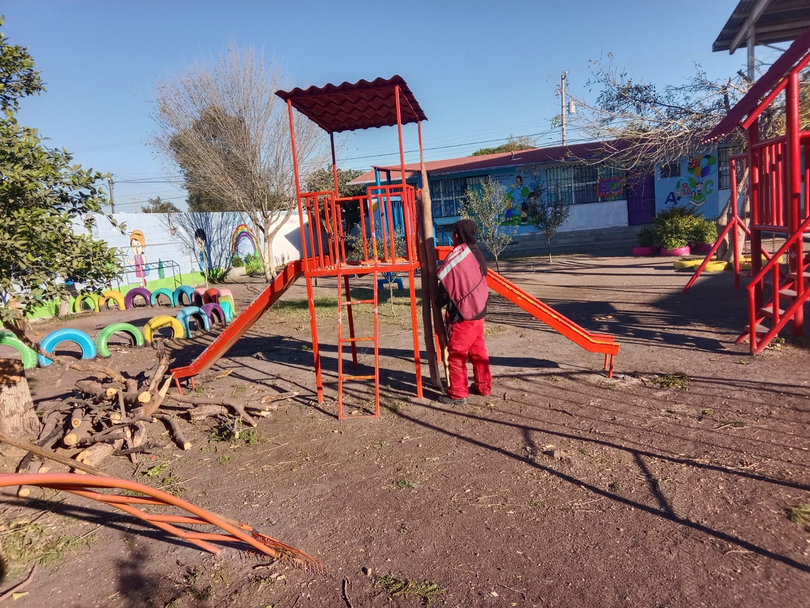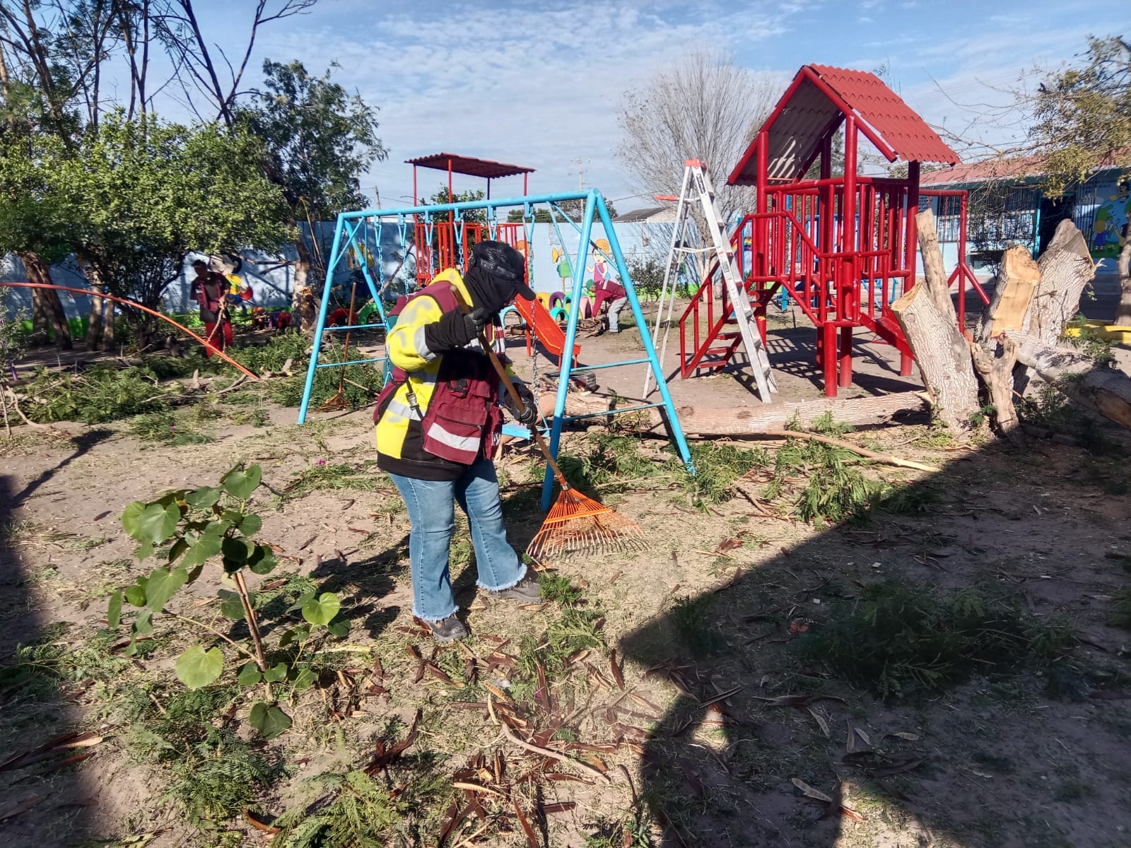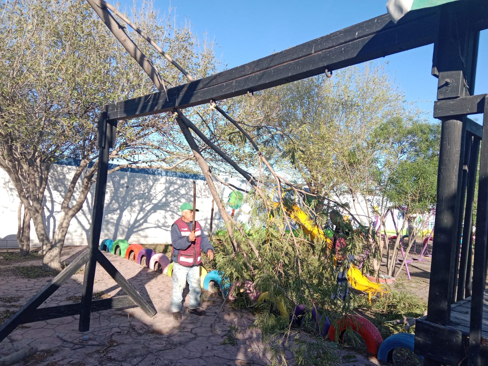 Como parte de esta estrategia, el Presidente Municipal coordinó con la Secretaría de Servicios Públicos trabajos de limpieza general y poda de árboles en el jardín de niños Emma Vásquez, ubicado en la colonia Lomas Real de Jarachina Sur, con el objetivo de mejorar las condiciones del plantel y prevenir riesgos para alumnos, docentes y padres de familia.