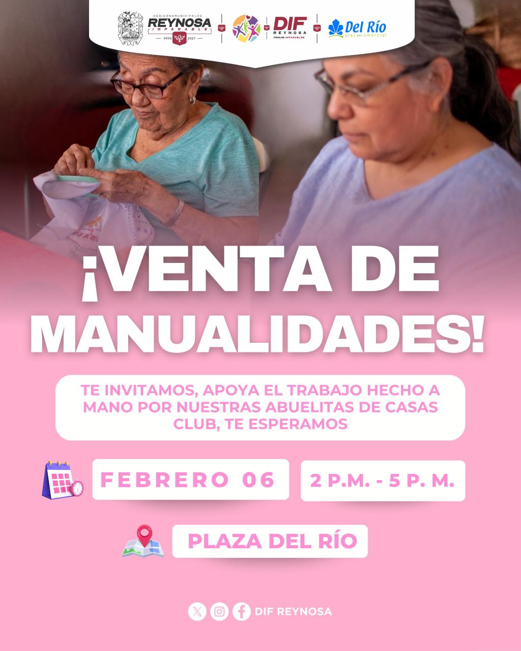 Con el fin de apoyar el talento y la creatividad de las abuelitas que forman parte de las Casas Club, el Sistema DIF-Reynosa que preside Carlos Luis Peña Garza, invita a la ciudadanía a apoyar la venta de manualidades que se llevará a cabo hoy viernes 06 de febrero en el Centro comercial Plaza del Río.