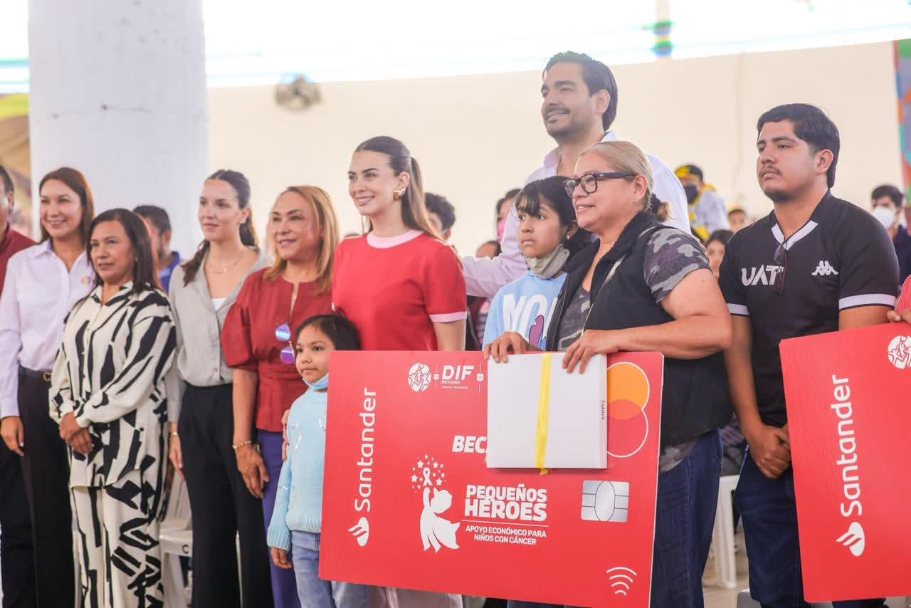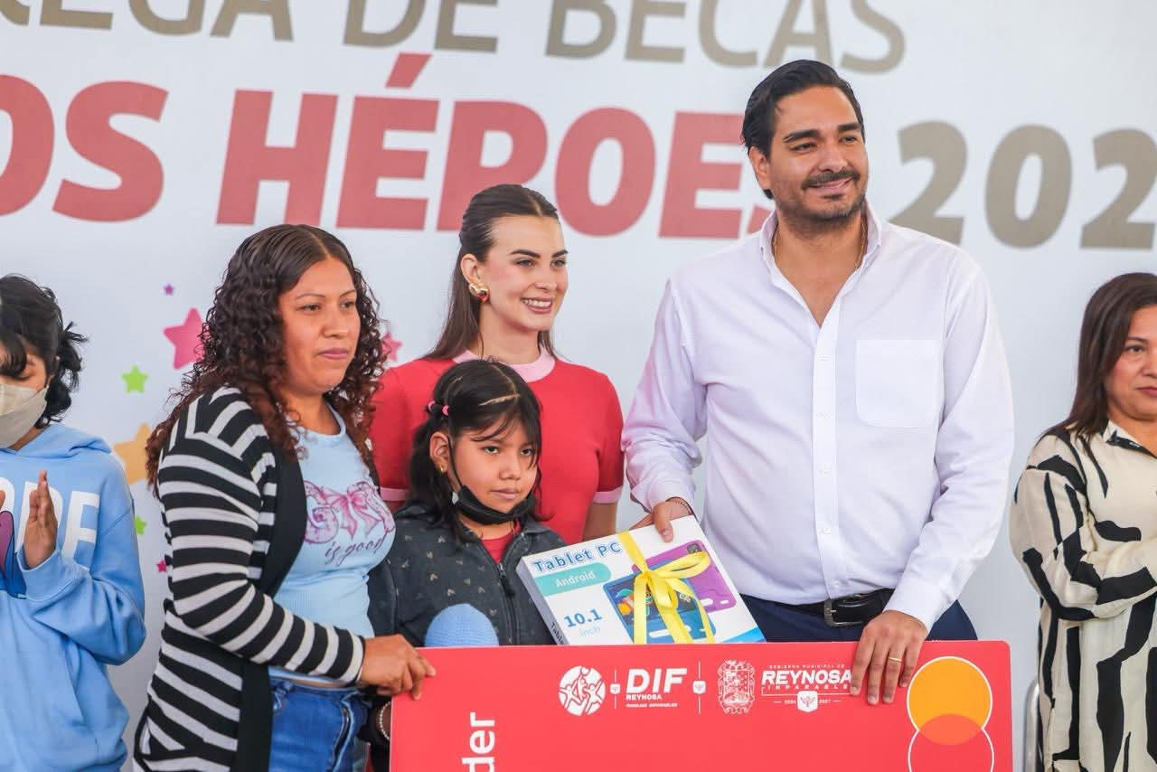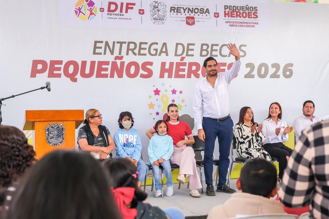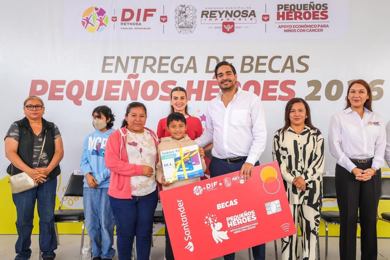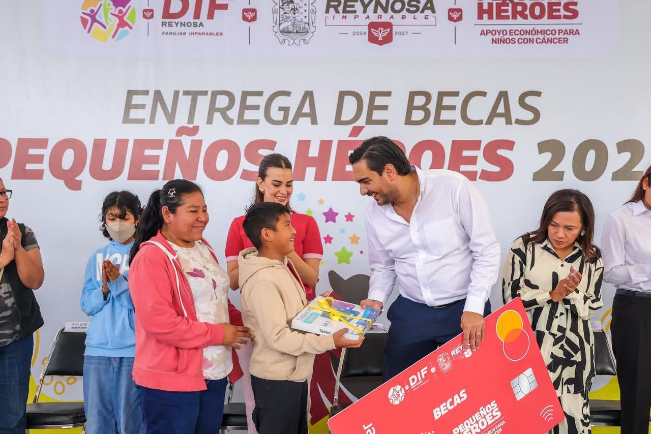 El Alcalde Carlos Peña Ortiz acompañado por su esposa la Presidenta del Voluntariado DIF-Reynosa, Alejandra Yelitza Garza, encabezó la Entrega de Becas Pequeños Héroes 2026, los apoyos económicos para niños con cáncer.