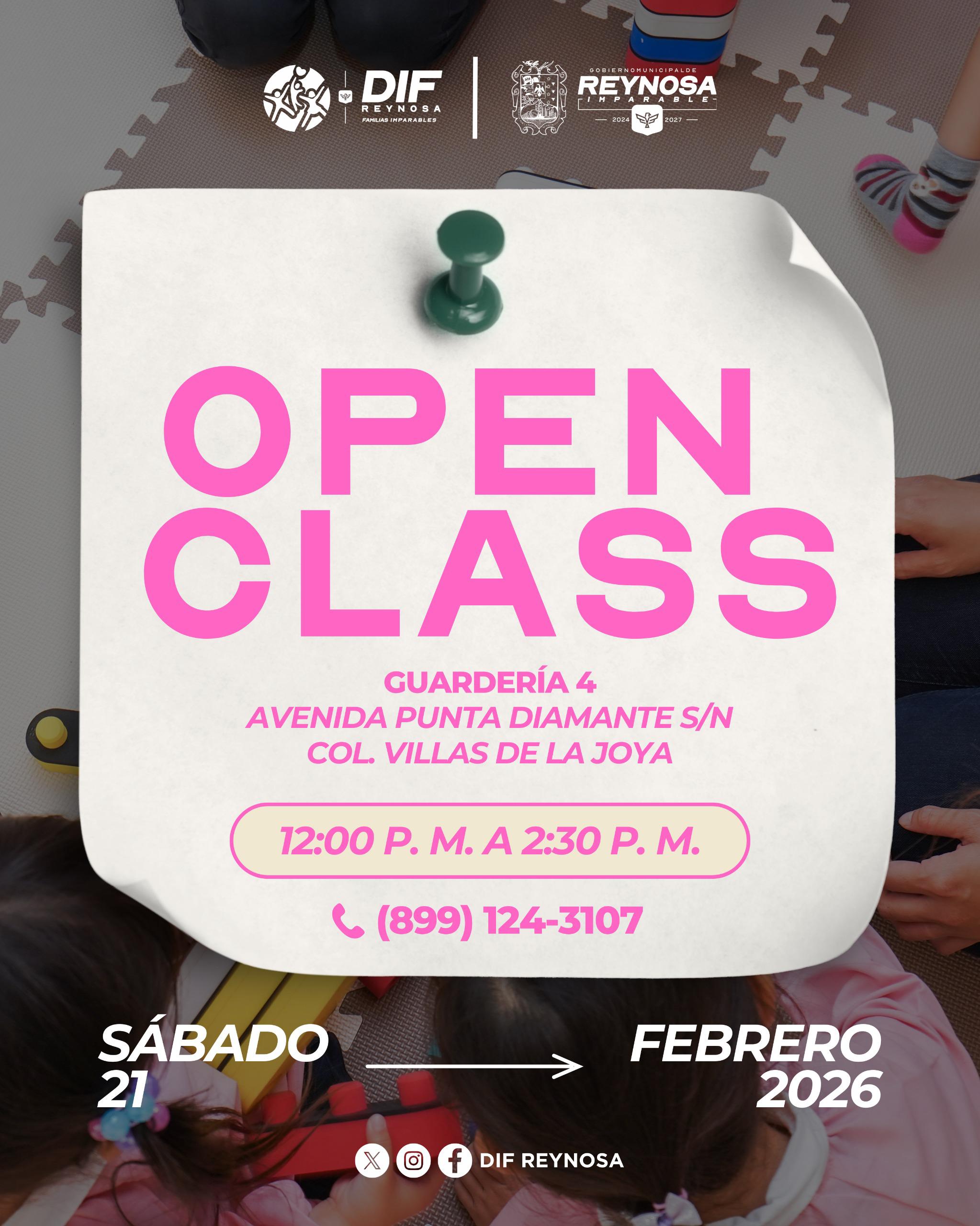 El Sistema DIF-Reynosa que preside Carlos Luis Peña Garza, invita a madres y padres de familia, a participar en el Open Class que se realizará hoy sábado 21 de febrero en la Guardería 4, ubicada en avenida Punta Diamante s/n, en la colonia Villas de la Joya, en un horario de 12:00 del mediodía a 2:30 de la tarde, con el propósito de que las familias conozcan las instalaciones y el trabajo que se realiza con las niñas y niños.