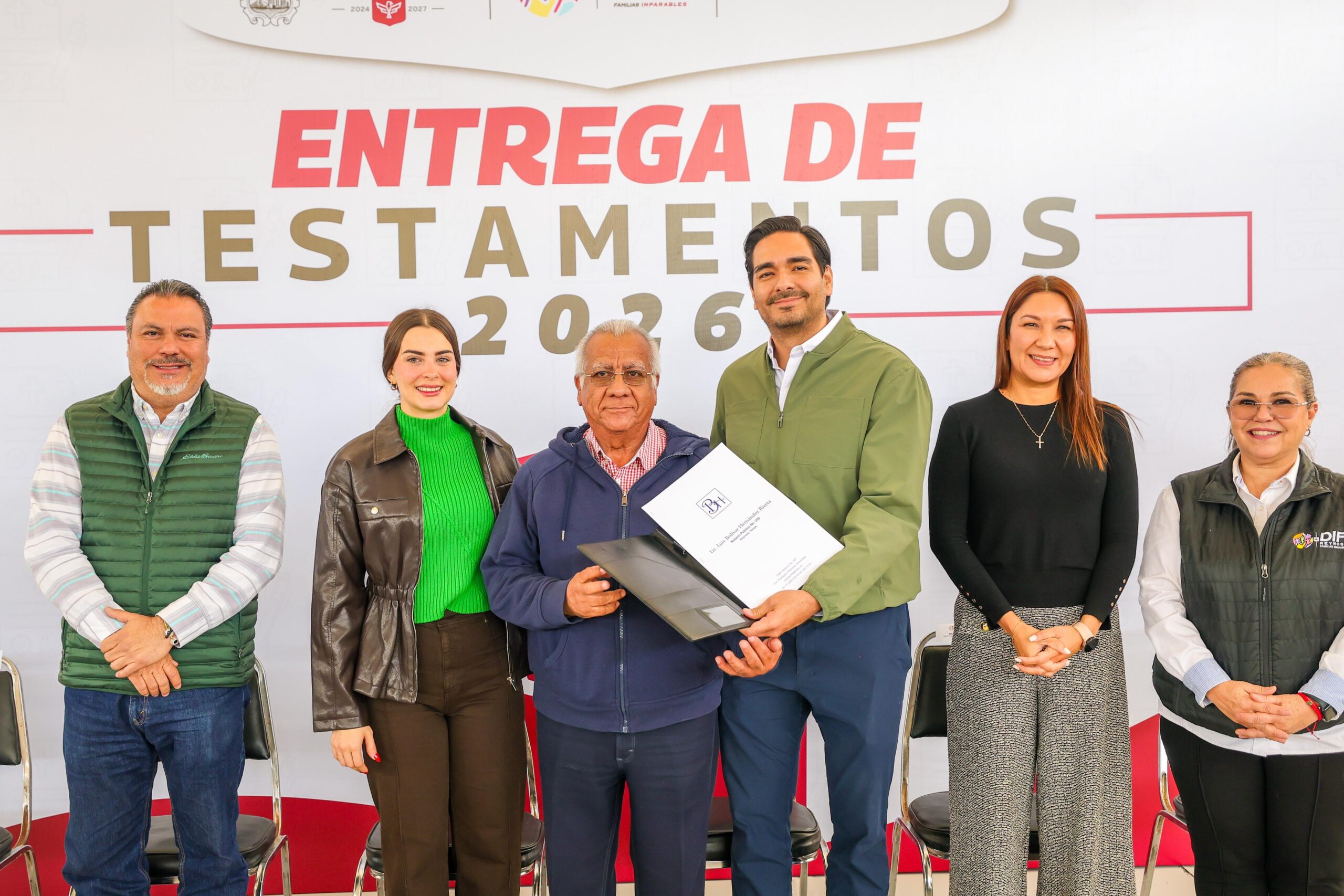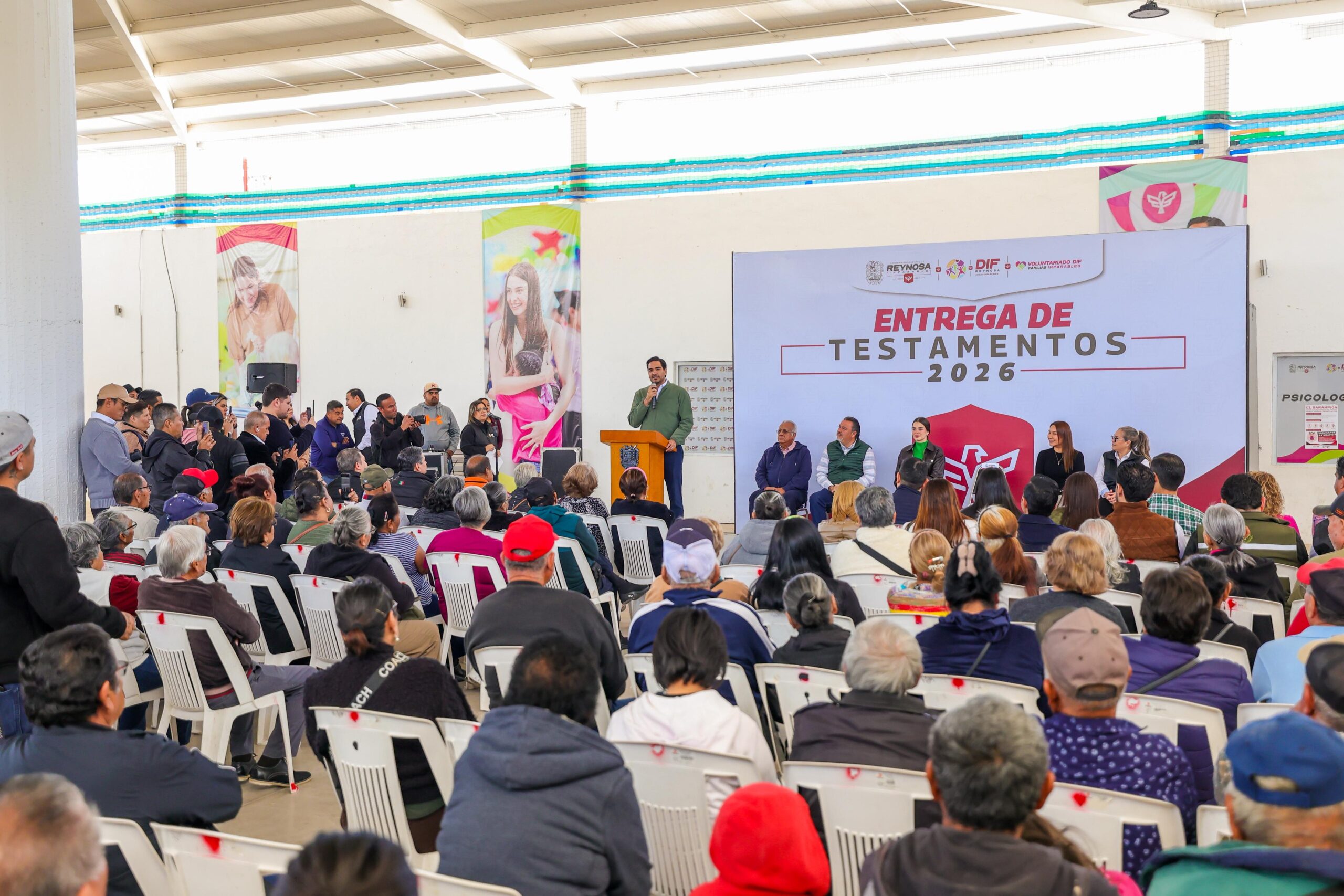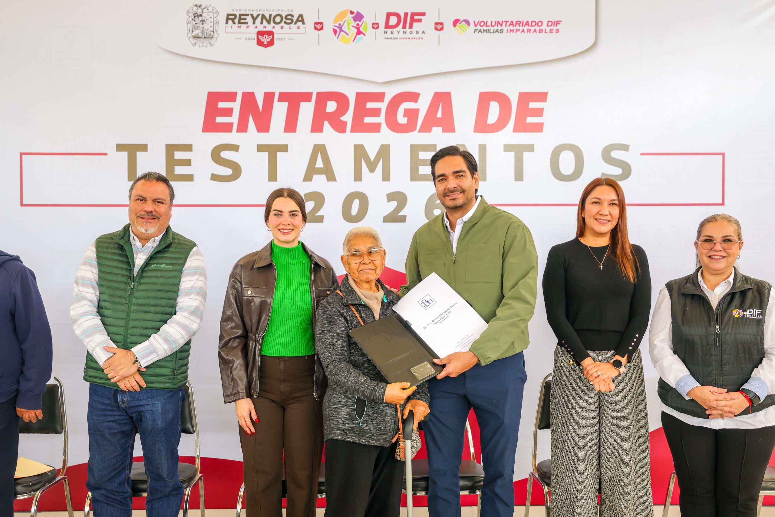 El Alcalde Carlos Peña Ortiz presidió este lunes 23 de febrero la ceremonia de Entrega de Testamentos 2026 que benefició a 55 adultos mayores de 65 años, siendo acompañado por su esposa, la Presidenta del Voluntariado DIF-Reynosa, Alejandra Yelitza Garza, impulsora de la iniciativa.