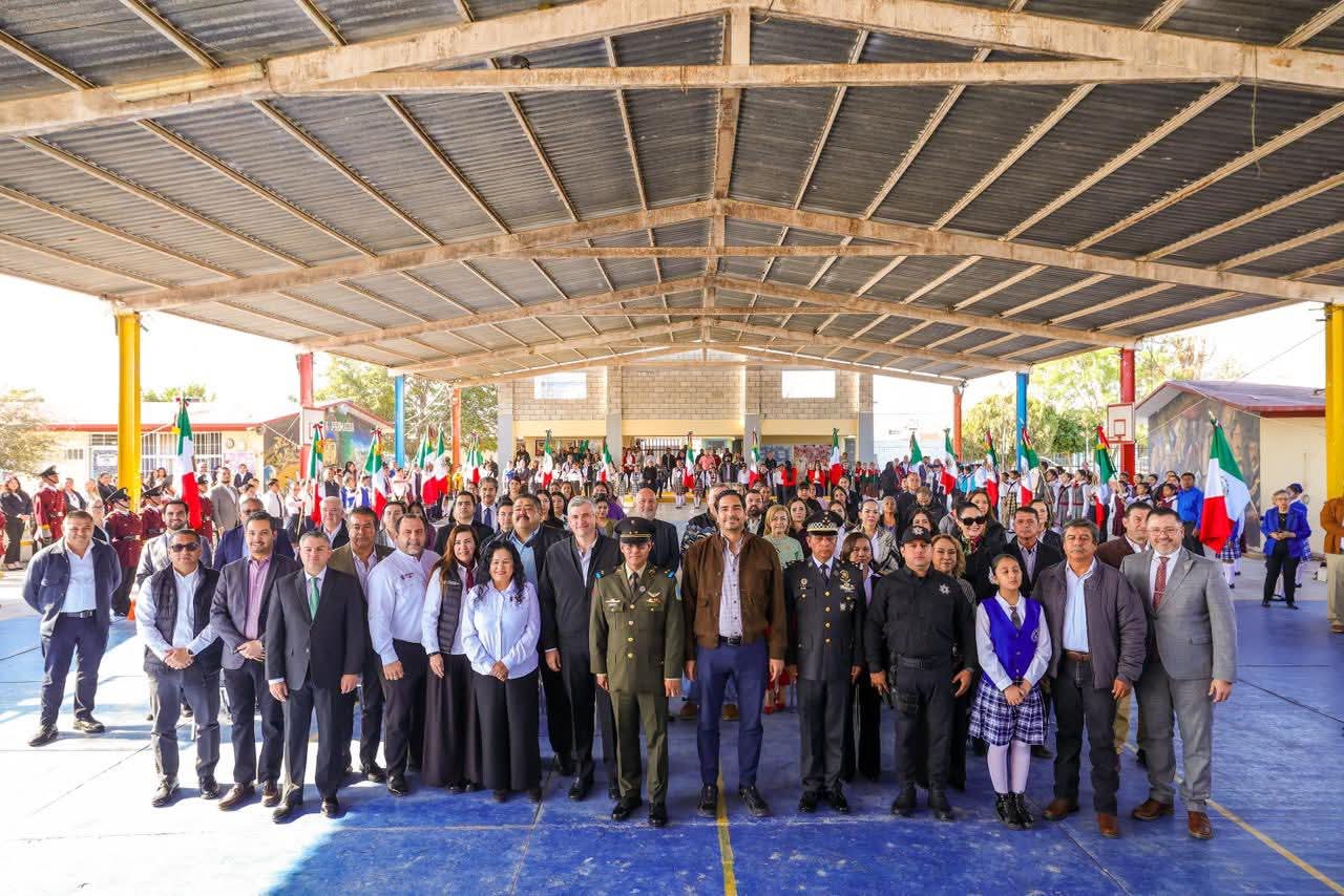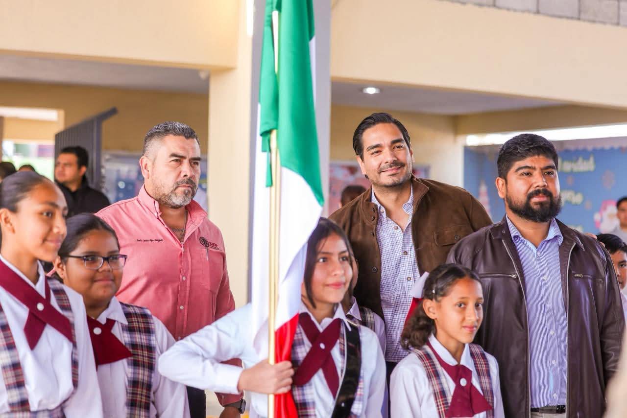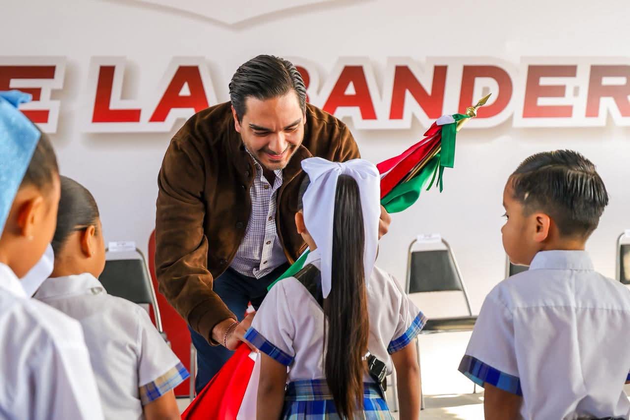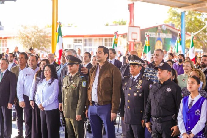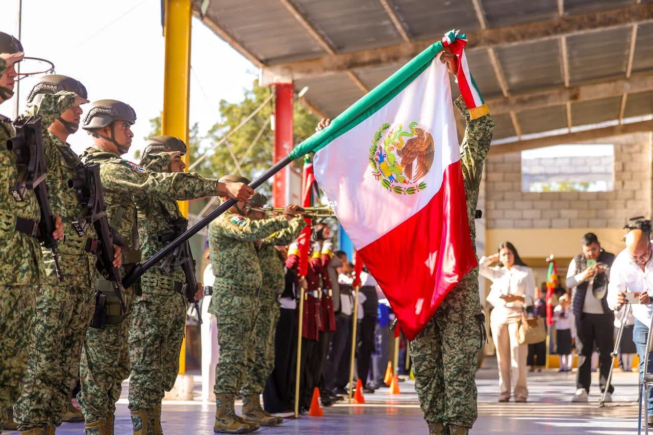 El Presidente Municipal Carlos Peña Ortiz participó este día, martes 24 de febrero, en la Ceremonia Cívica del Día de la Bandera de México 2026, acompañado por el Teniente Coronel Francisco Javier Delgado Gil, Segundo Comandante del 19° Regimiento de Caballería Motorizado de la Octava Zona Militar y el Diputado Local Juan Carlos Zertuche Romero, en la escuela primaria Escudo Nacional, que dirige el Profesor Rodolfo Herrera Vázquez.