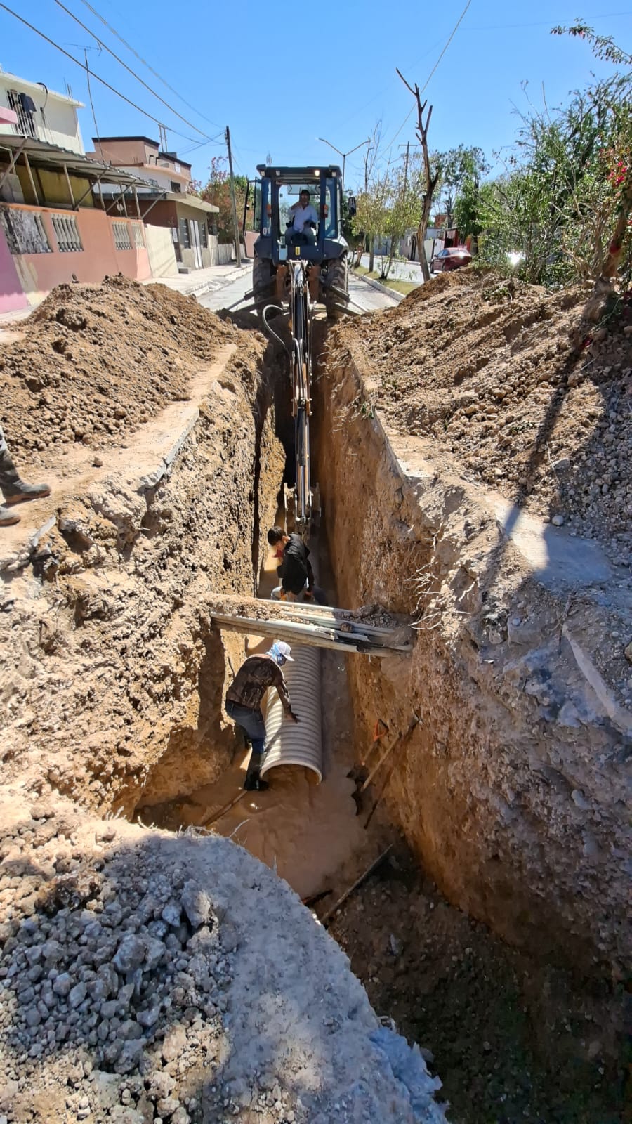 Como parte de estas maniobras, se realiza el reemplazo de 132 metros lineales de tubería de PVC de 24 pulgadas de diámetro, acciones que permitirán fortalecer la infraestructura sanitaria, optimizar el flujo de aguas residuales y prevenir futuras afectaciones a las familias de la zona.