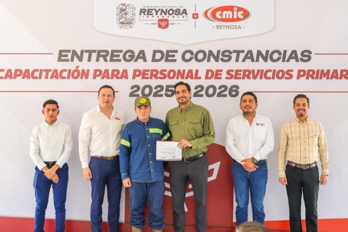 El Presidente Municipal Carlos Peña Ortiz entregó los reconocimientos que trabajadores de Servicios Públicos del R. Ayuntamiento obtuvieron al aprobar los cursos de capacitación impartidos por la Cámara Mexicana de la Industria de la Construcción, CMIC, que preside Roberto Aviles Arizpe.
