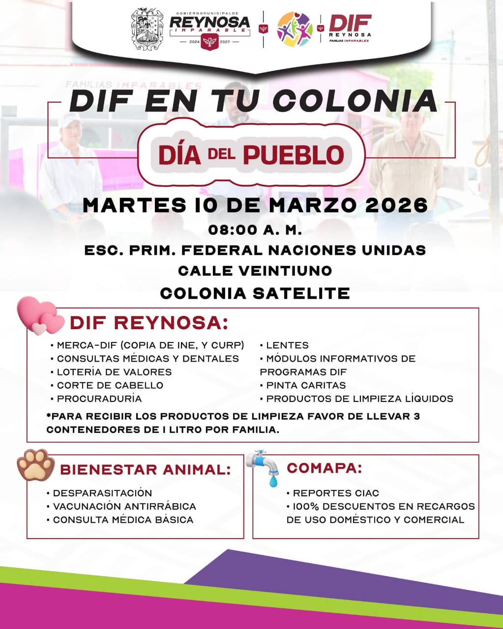 Con el objetivo de acercar servicios y programas a la ciudadanía, el Sistema DIF-Reynosa que preside Carlos Luis Peña Garza, realizará la Brigada “DIF en tu Colonia» el próximo martes 10 de marzo a las 08:00 de la mañana, en la Escuela Primaria Federal Naciones Unidas, ubicada en calle 21 de la colonia Satélite.