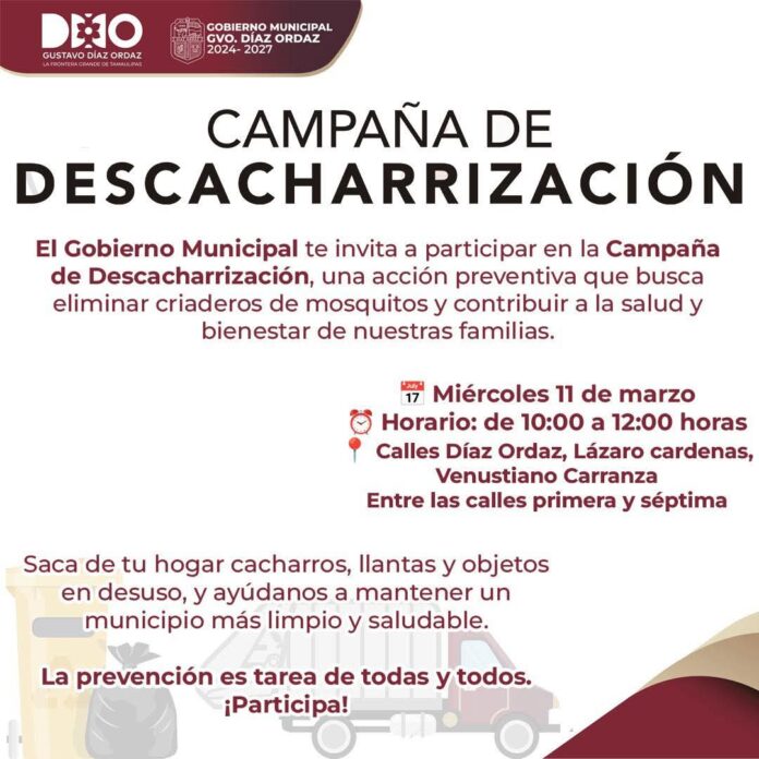 DÍAZ ORDAZ, TAM. – Con el objetivo de proteger la salud de las familias y mejorar las condiciones del entorno urbano, el Gobierno Municipal, encabezado por la Alcaldesa Nataly García Díaz, puso en marcha una serie de recorridos por distintos sectores del municipio para retirar objetos que puedan convertirse en focos de reproducción de mosquitos.